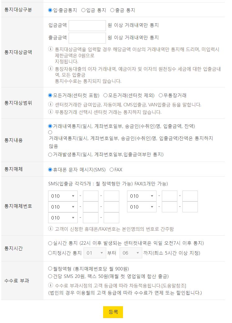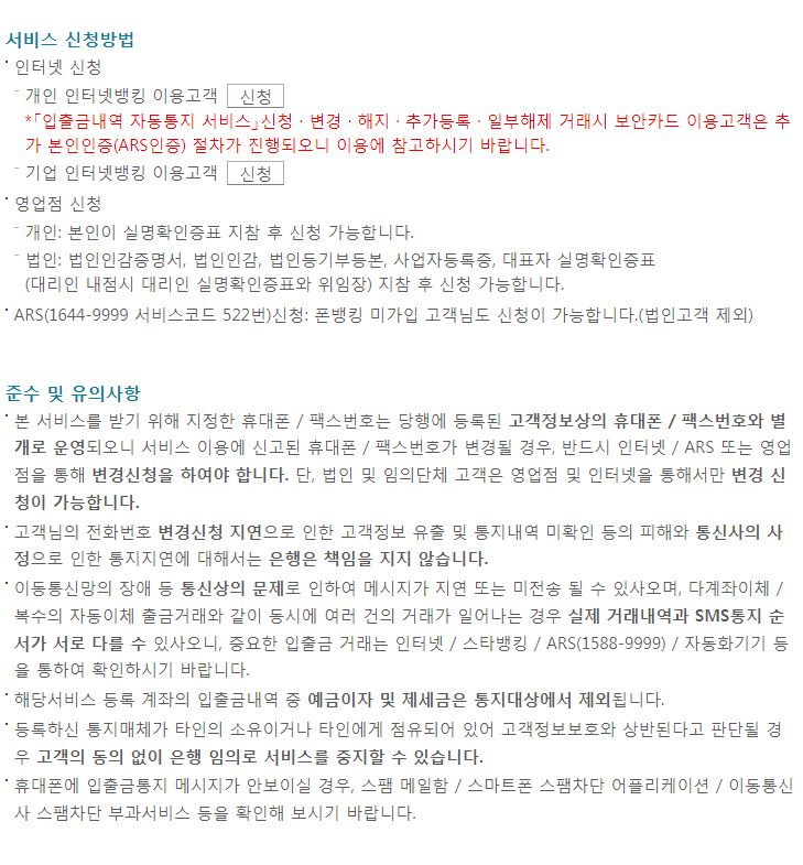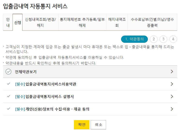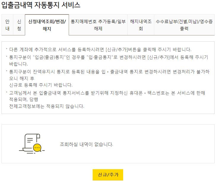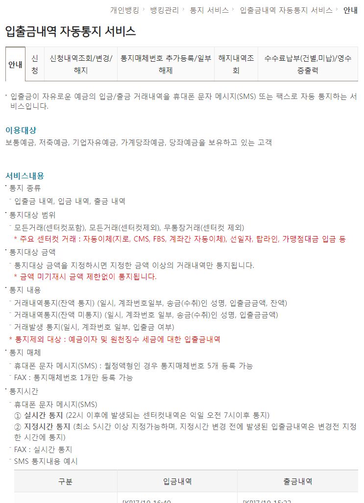 개인뱅킹> 뱅킹관리> 통지 서비스> 입출금내역 자동통지 서비스