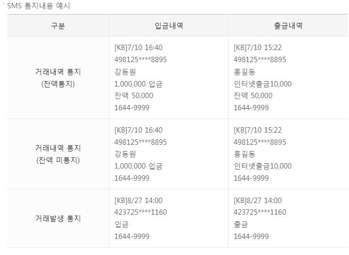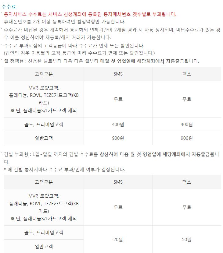 다른 은행도 그렇고 신용카드사(카드앱)도 그렇지만, KB국민은행 모바일뱅킹앱인 KB스타뱅킹 앱을 전화기에 깔았다면, 그냥 그 앱의 알림서비스란에 들어가서 입출금 알림을 확인해줘도 전화기에 앱 알림이 뜹니다(그건 무료입니다). 하지만 그것보다 그냥 SMS문자로 뜨는 게 편한 분들이 가끔 있죠. 그런 분들은 이렇게 일반 문자메시지가 오게 해줄 수 있습니다. 회원등급에 따라 월 최대 900원 정도가 나옵니다.