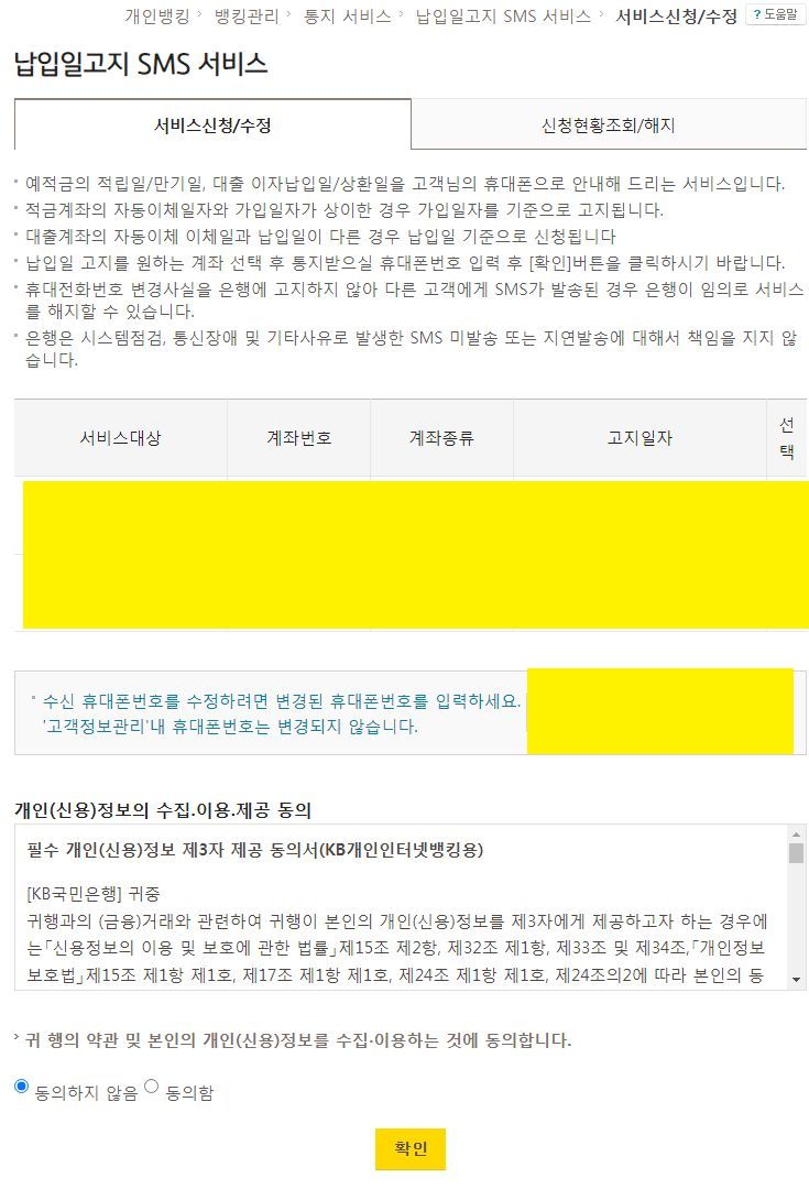 개인뱅킹> 뱅킹관리> 통지 서비스> 납입일고지 SMS 서비스
