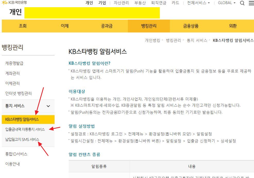 개인뱅킹> 뱅킹관리> 통지 서비스> KB스타뱅킹 알림서비스