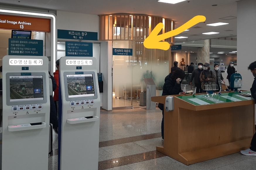 동관 건물의 "처음 오신 분"(이 병원에 처음 외래진료받으러 온 사람, 다른 병원에서 의뢰서를 받아 처음 온 사람) 창구와 "외부영상저장"(다른 병원의 진료기록에서 영상자료시디 제출) 창구의 오른편에, "비즈니스창구"가 있고 그 옆에 "컨시어지 라운지"라고 보입니다.