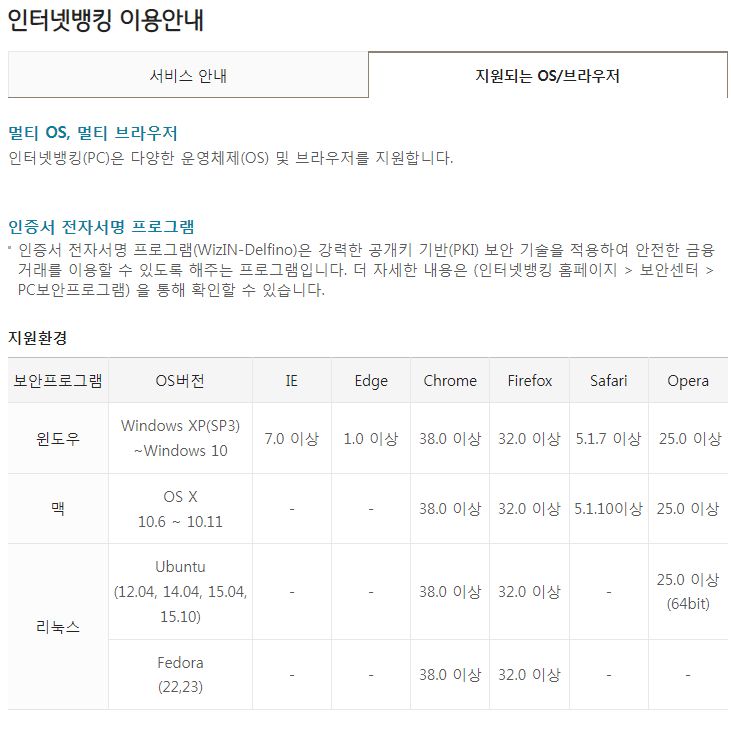 지원되는 OS/브라우저 ( 개인뱅킹 | 뱅킹관리 | 이용안내 | 인터넷뱅킹 이용안내 | 지원되는 OS/브