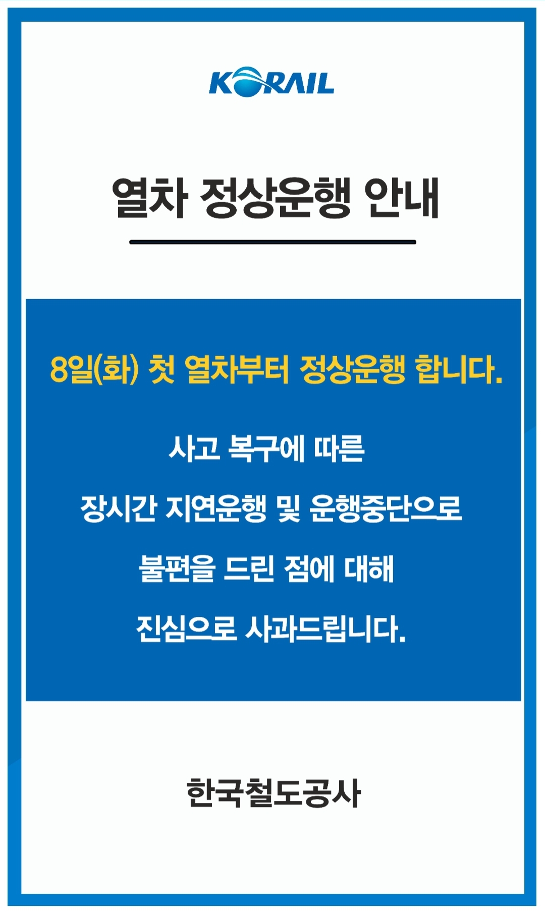 코레일 2022.11.8(화)요일부터 열차정상운행 중 본문