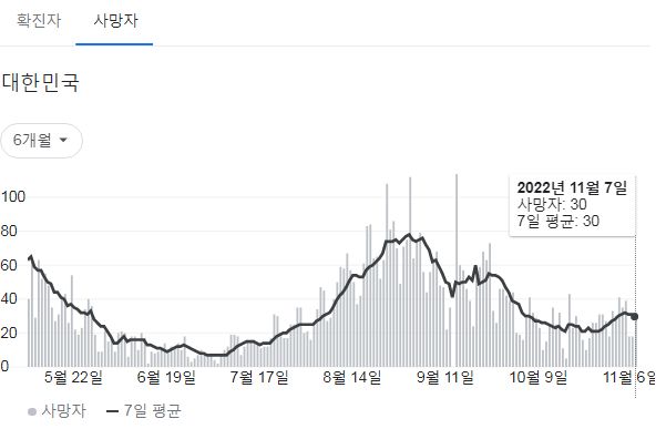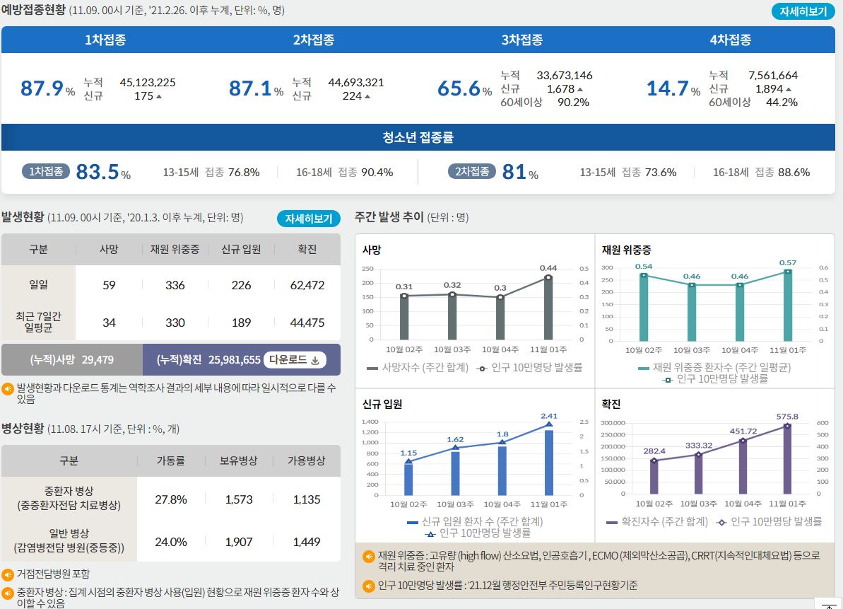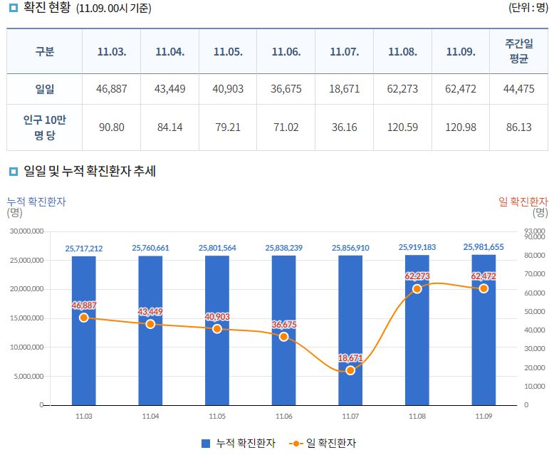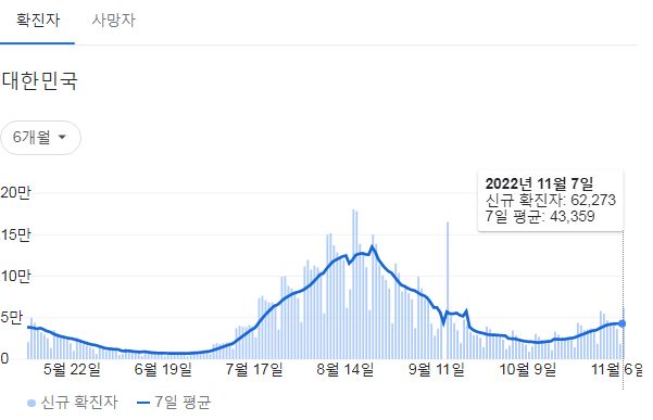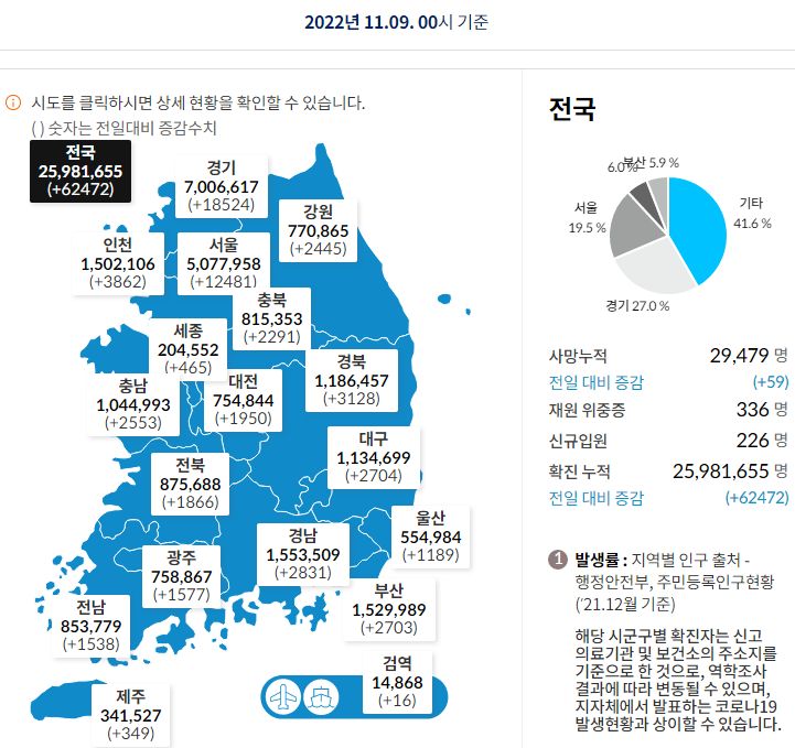 코로나19집계(2022.11.8. 기준) 확진 +6.2만, 사망 +30명, 중환자병상가동률 27% 본문
