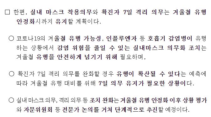 확진자 7일 격리의무, 실내마스크착용의무는 겨울 유행이 끝날 때까지 유지할 계획