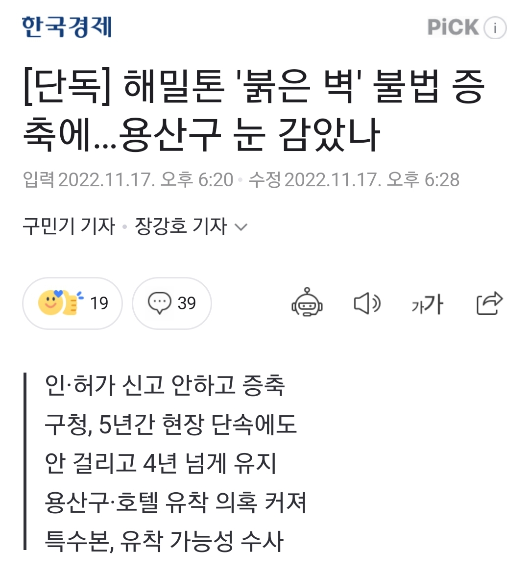 일단 그 분홍벽은 건물주가 꼼수를 쓴 것 같다는 내용이 기사에 나옵니다. 첫 번째 기사에 나오는 "이행강제금"을 부과받은 곳이 그 분홍벽이 맞는지는 모르겠는데, 호텔영업장 중 다른 부분도 불법 증축이라네요.