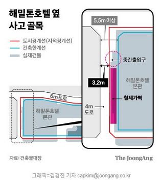 호텔 왼쪽 골목에 철벽을 쳐서 골목을 불법점유하고 벽 반대편은 건물 내부인 양 자기들 영업에 사용하면서, 그렇게 길을 좁혀 통행을 방해한 것이라고 합니다. 사고 골목의 그 분홍색 벽은 건물벽이 아니라 업자의 불법시설물이었던 것이죠.