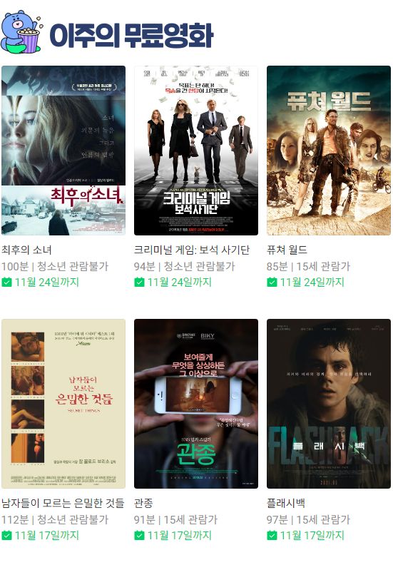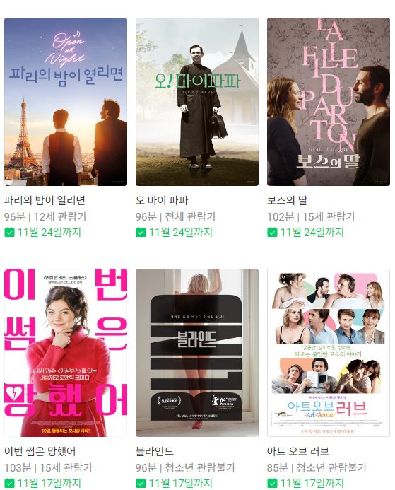이번주는 좀 소박하네요. 장르는 다양해보이는데 연령제한영화도 여럿 있고.