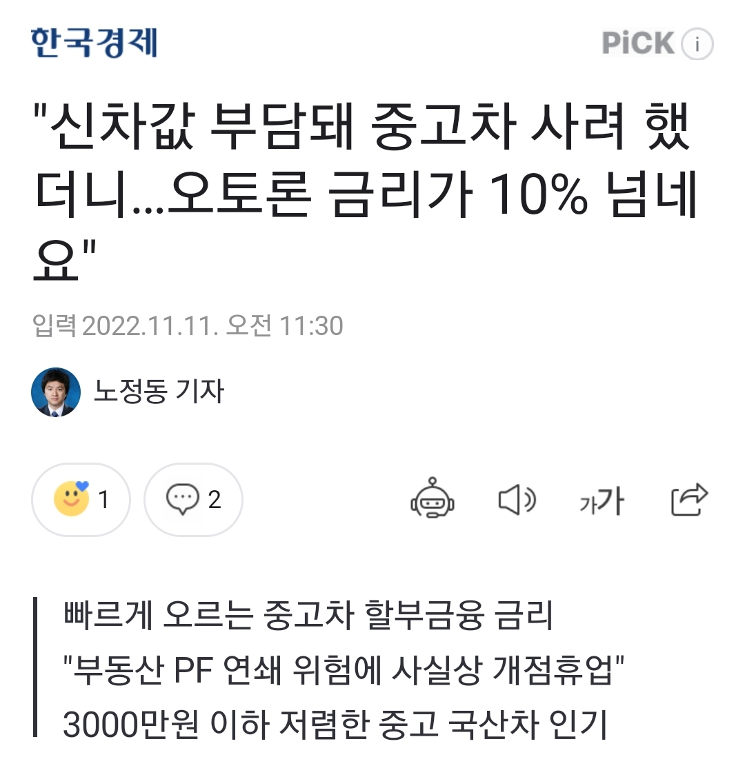 ㅡ 금리가 크게 올라 이자부담이 커서 수입차, 고가중고차 거래는 확 줄었고, 3천만원 아래 국산 중고차위주로 시장이 굴러간다는 기사.