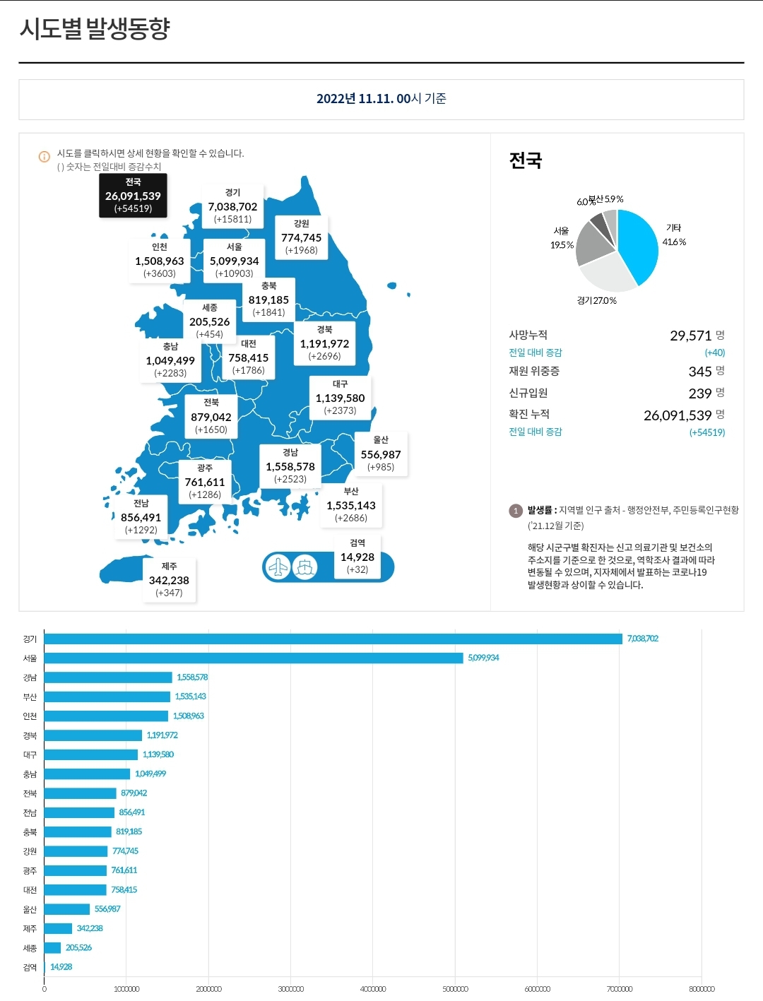 | 코로나19집계(2022.11.12. 0시기준) 확진 +5.4만, 사망 +46명, 위중증병상가동률 32% (0) | 2022.11.11 |