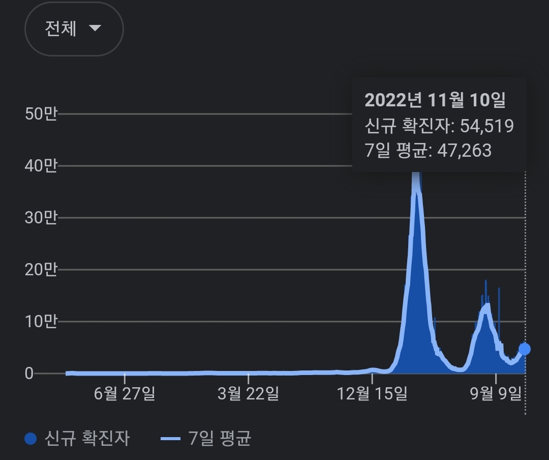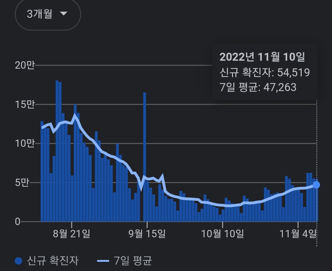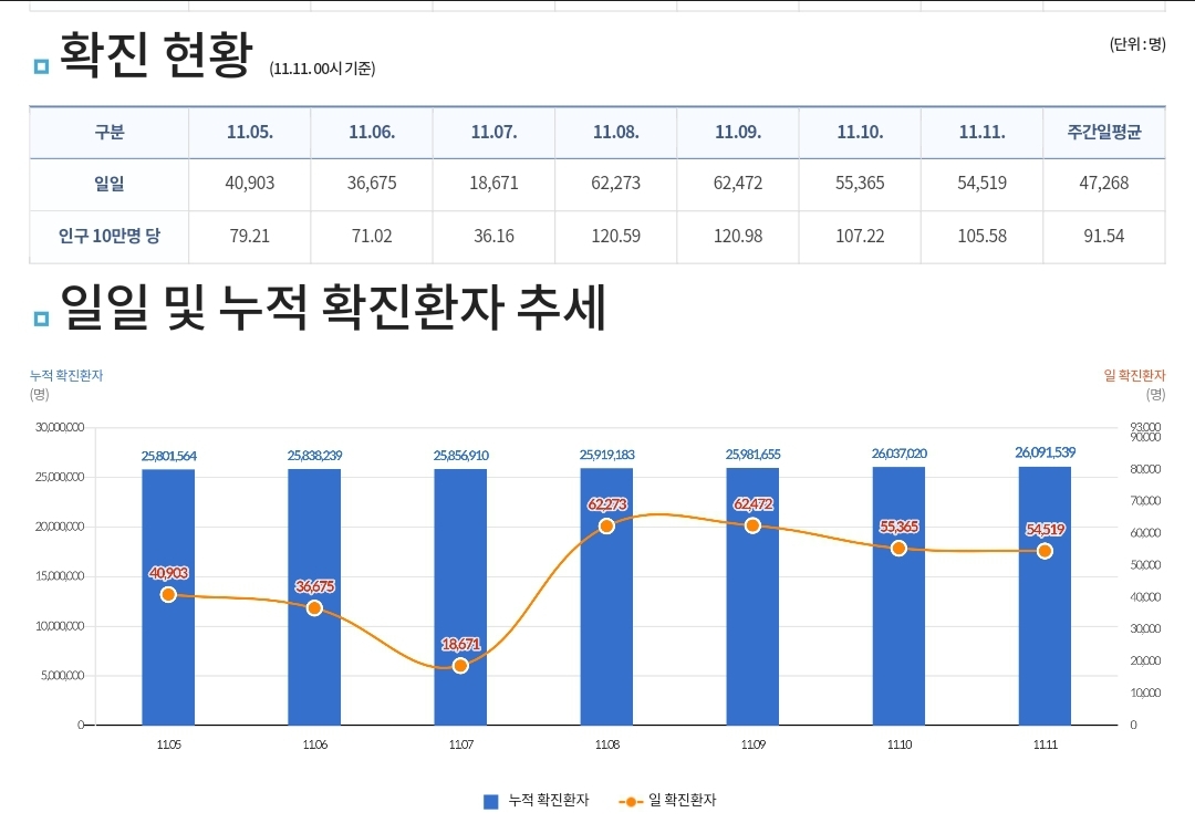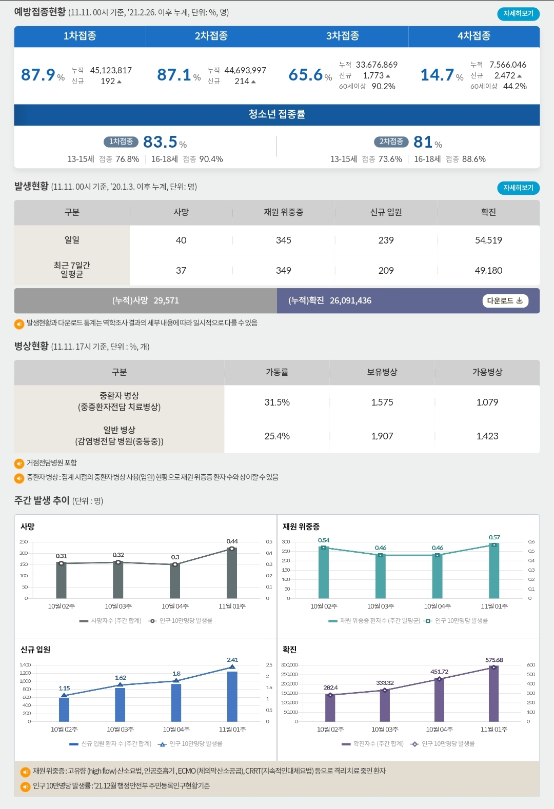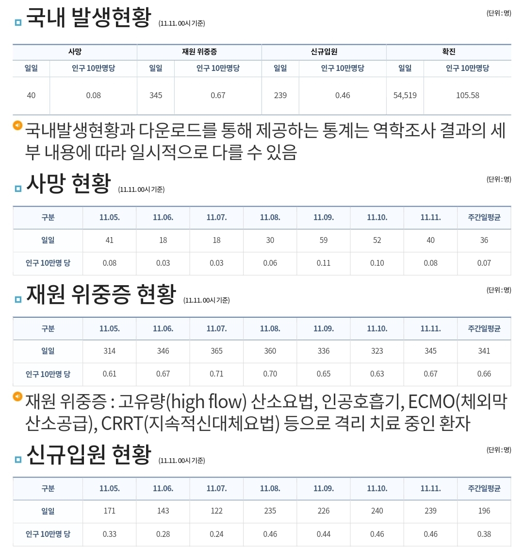 코로나19집계(2022.11.11. 0시기준) 확진 +5.5만, 사망 +40명, 중환자병상가동률 32% 본문