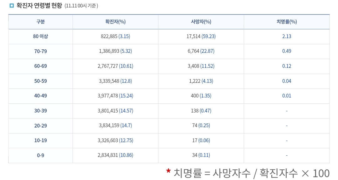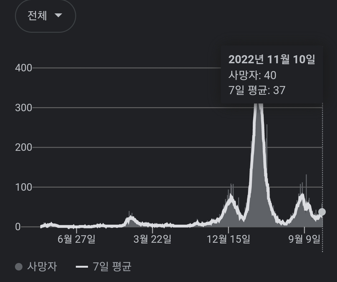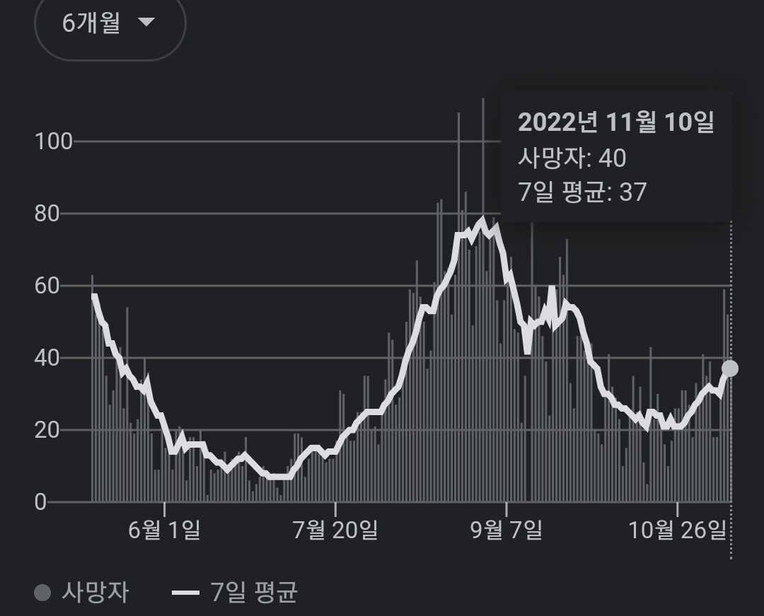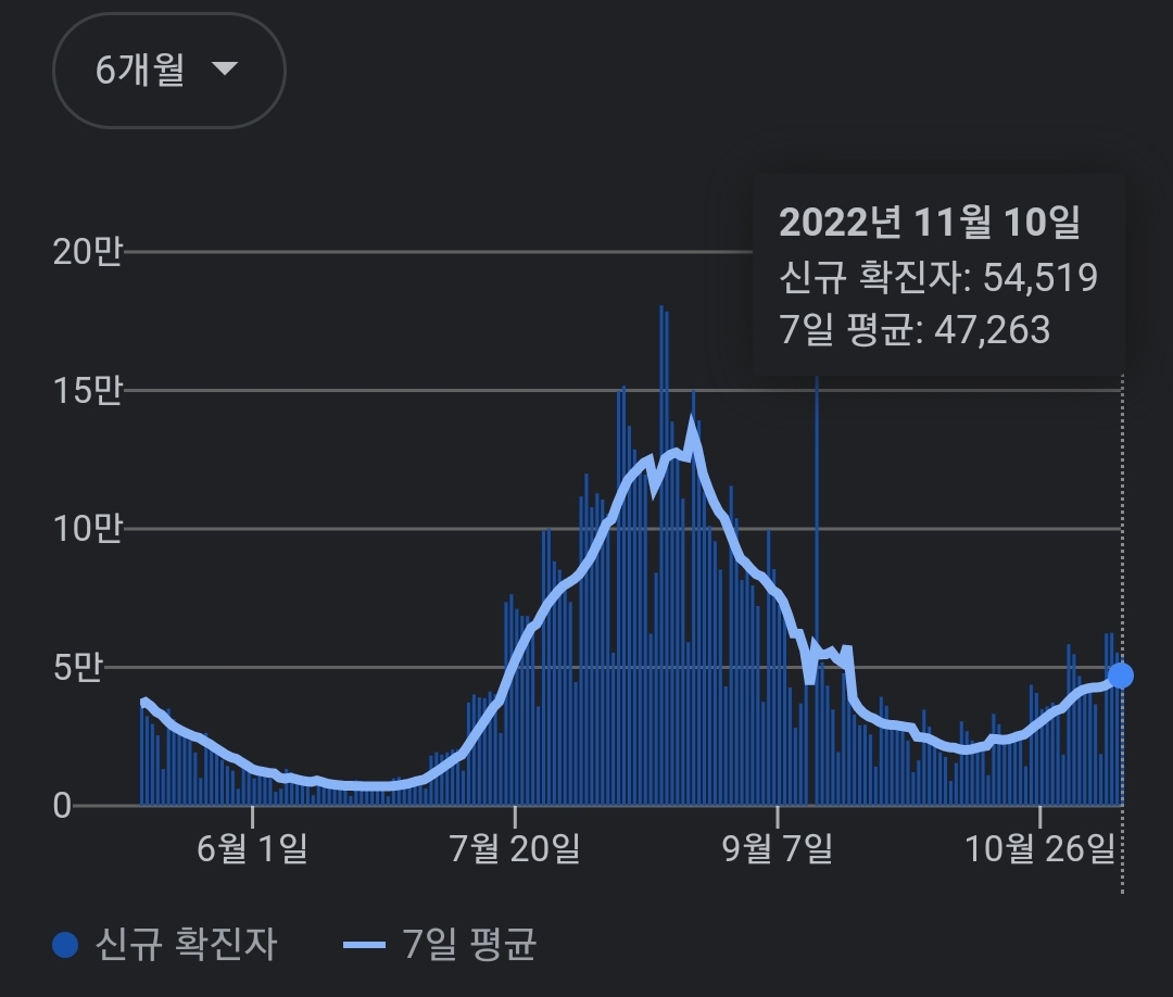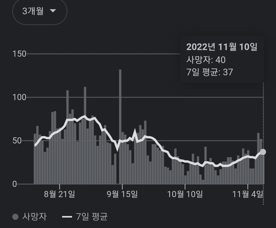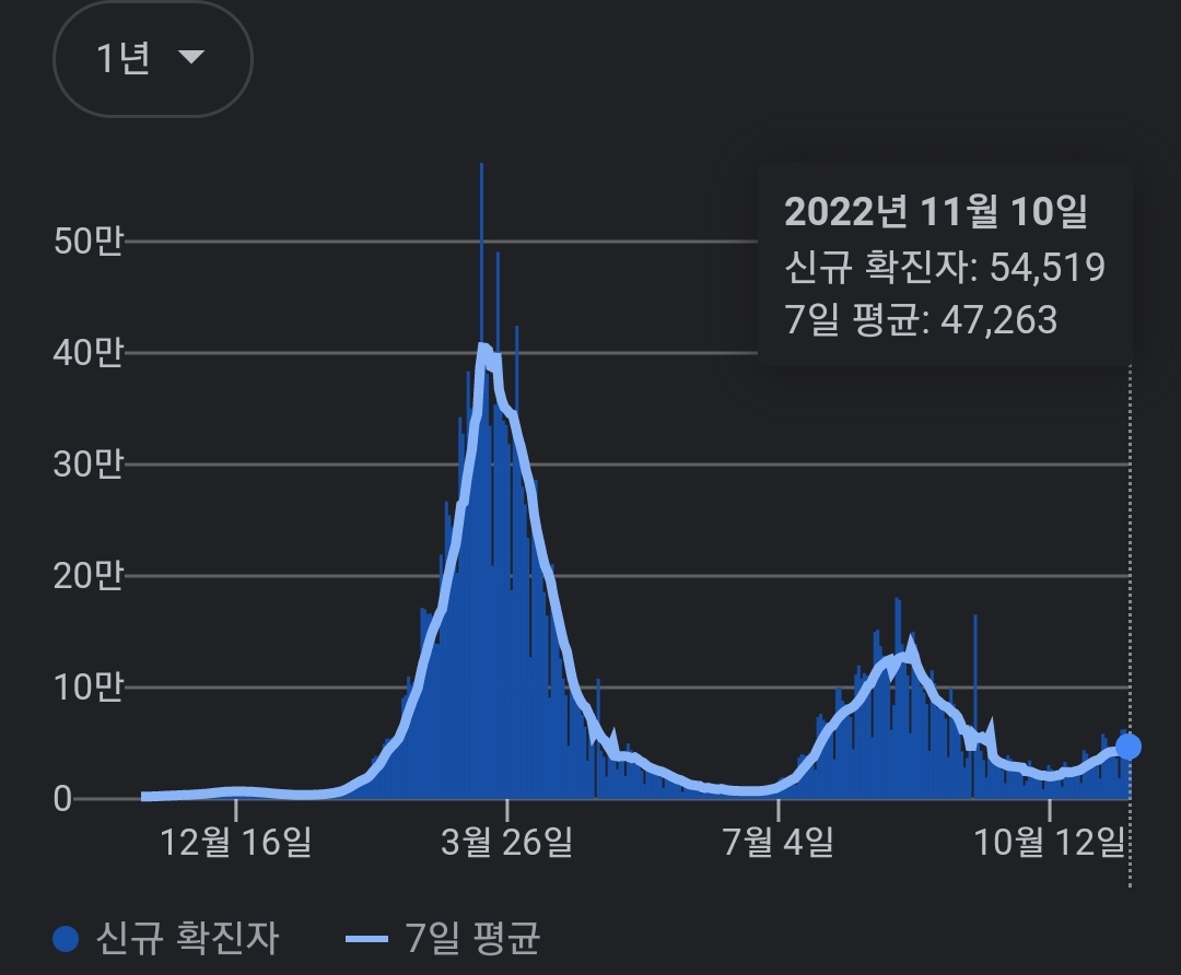 코로나19집계(2022.11.11. 0시기준) 확진 +5.5만, 사망 +40명, 중환자병상가동률 32% 본문