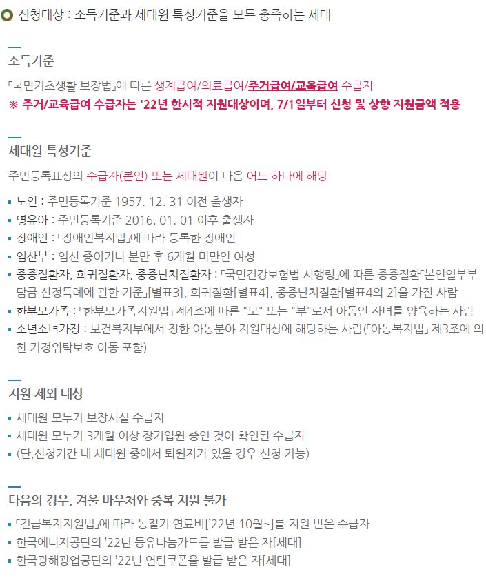생계급여/의료급여/주거급여/교육급여 수급자 중 하나로서 '세대원특성기준'을 충족하는 경우 신청가능