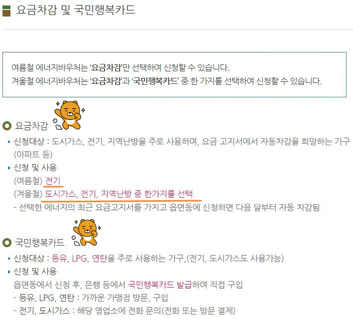 ㅡ 아래 설명을 보면, 등유/LPG/연탄을 사용할 때는 국민행복카드, 국민행복카드로 도시가스나 전기요금을 결제하려면 전기/가스회사 지역 영업소에 방문해 그 카드로 방문결제라고 적혀있군요.