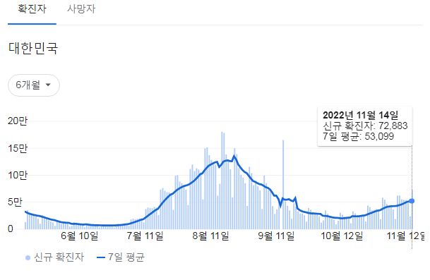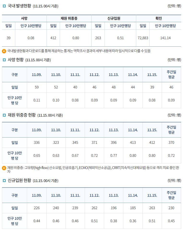 코로나19집계(2022.11.15. 0시기준) 확진 +7.2만, 사망 +39명, 중환자병상가동률 33% 본문