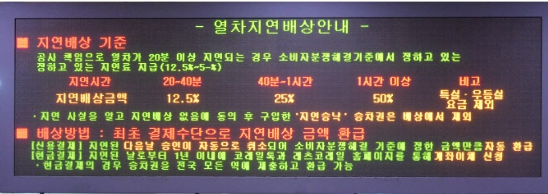 (출발지연된 열차를 기다리기 싫으면 환불받으라는 안내방송이 있었고, 그때문인지 다른 이유때문인지 모르겠는데 서울역 맞이방(대합실) 1층에는 줄선 사람이 많았죠. 운행취소된 열차편은 문자로 안내가 왔는데, 앱으로 수수료없이 취소됐습니다. 그러니 지연된 열차편도 그렇게 됐지 않았을까 생각해봅니다)