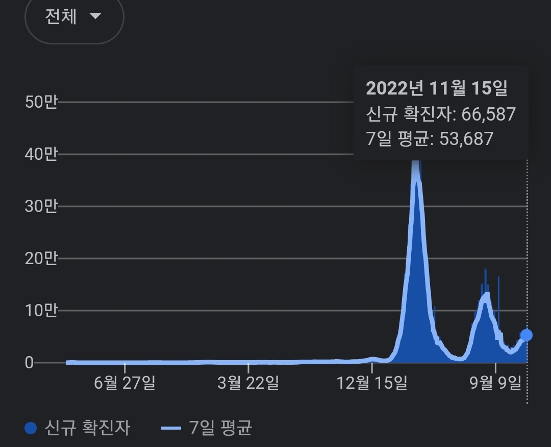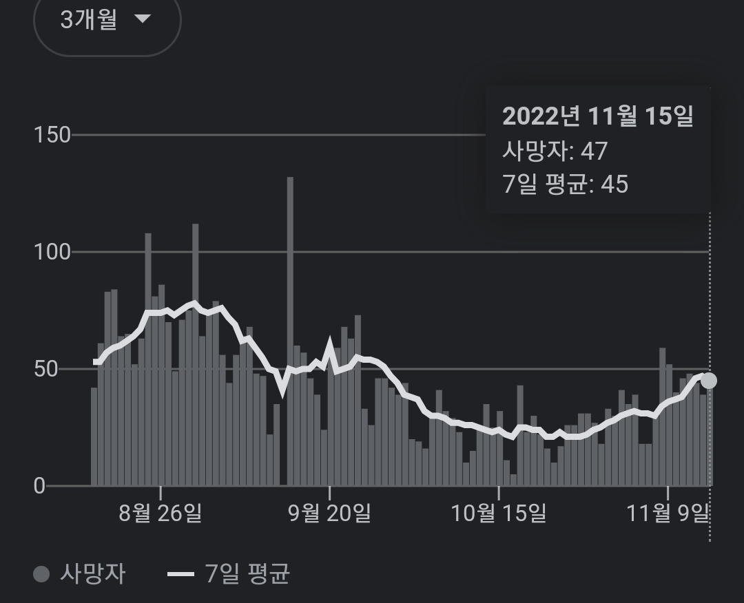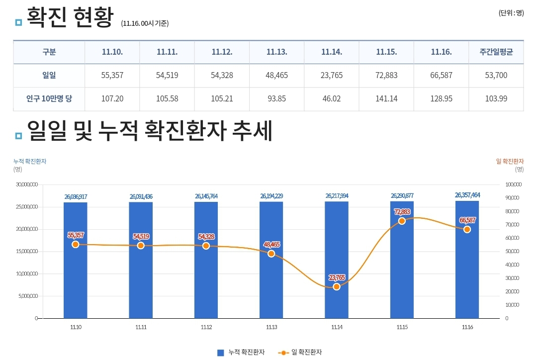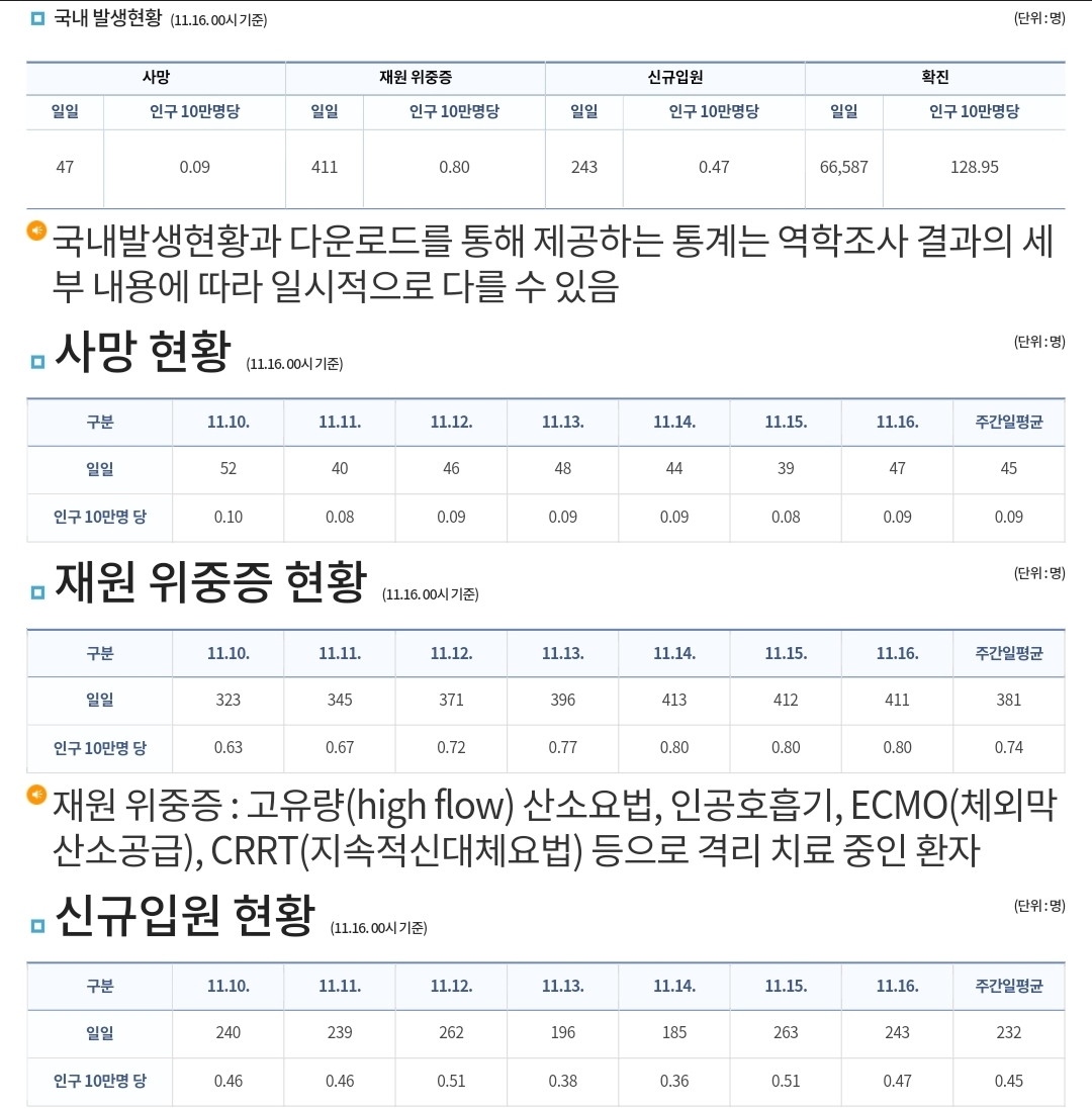 코로나19집계(2022.11.16. 0시기준) 확진 +6.7만, 사망 +47명, 중환자병상가동률 33% 본문