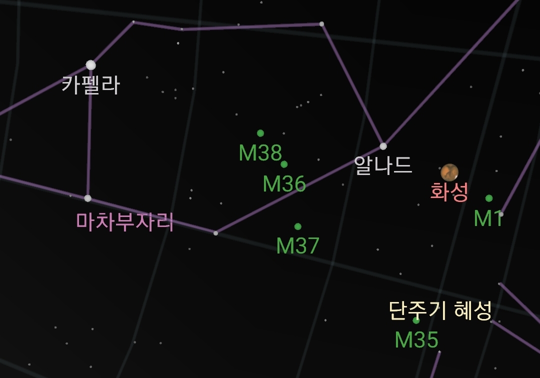 카펠라와 알나드가 속한 도형은 눈으로 볼 수 있는데, 슬쩍 붉은 저 별이 참 밝네요.