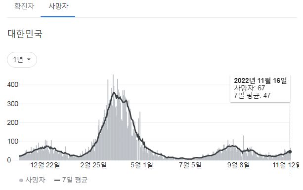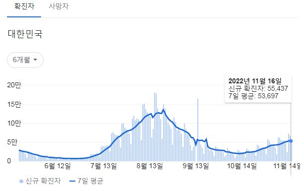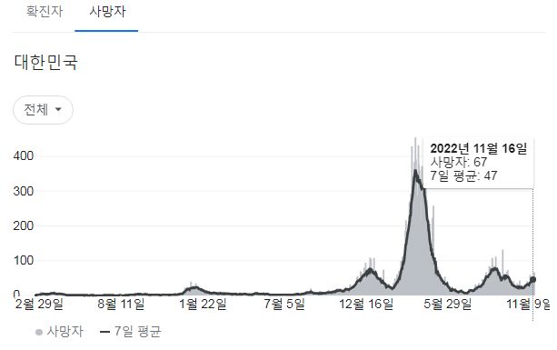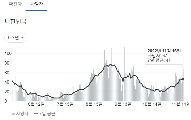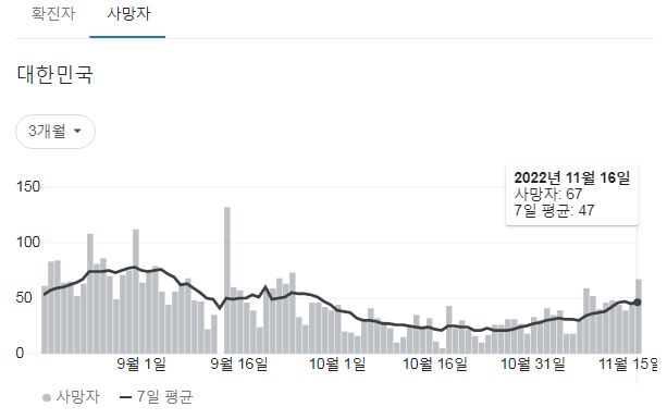 | 코로나19집계(2022.11.16. 0시기준) 확진 +6.7만, 사망 +47명, 중환자병상가동률 33% (0) | 2022.11.16 |