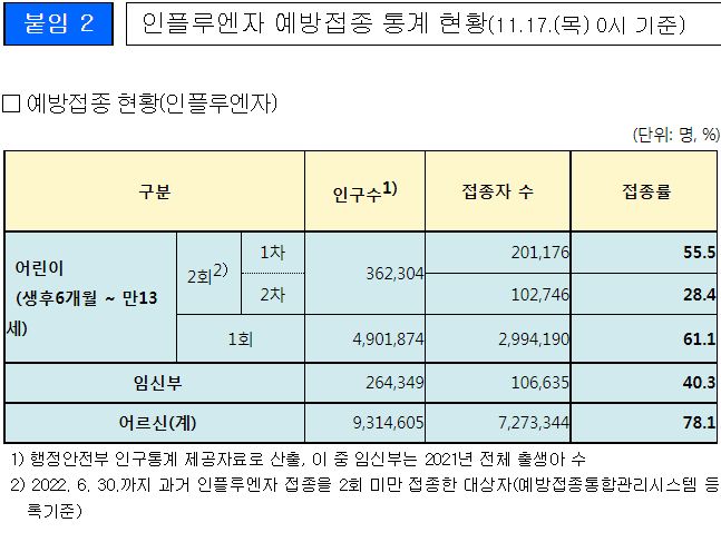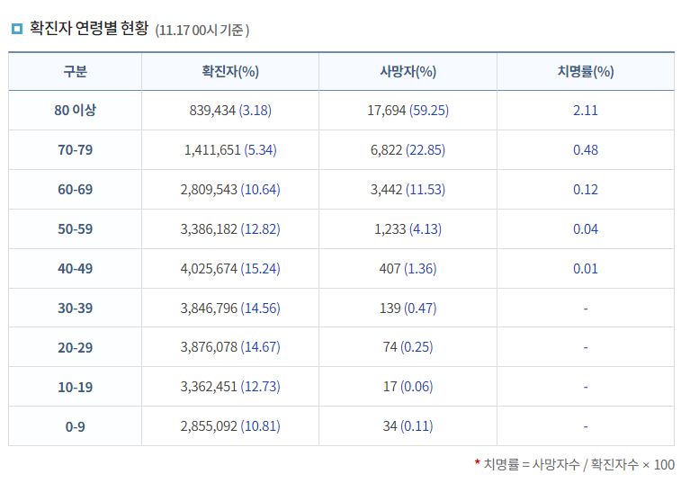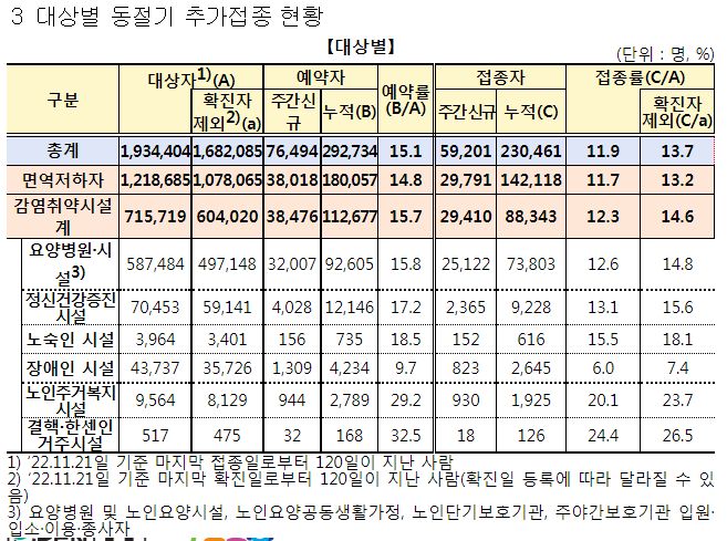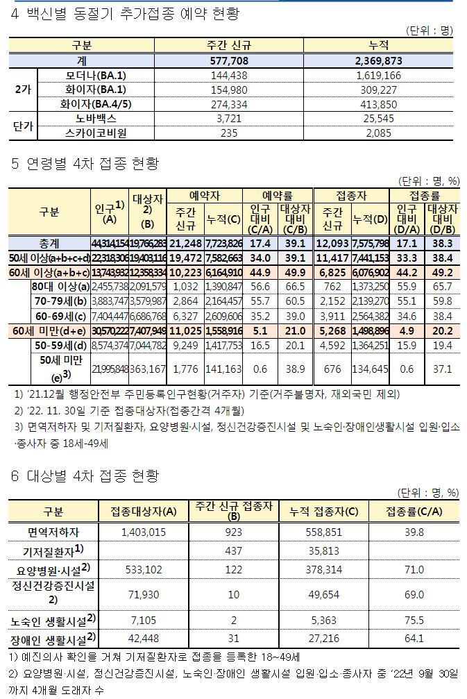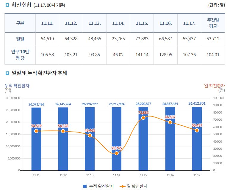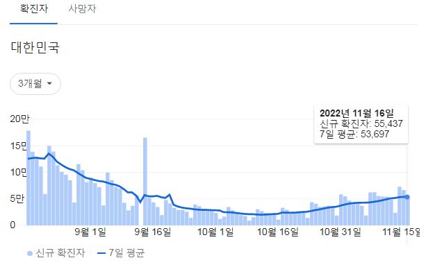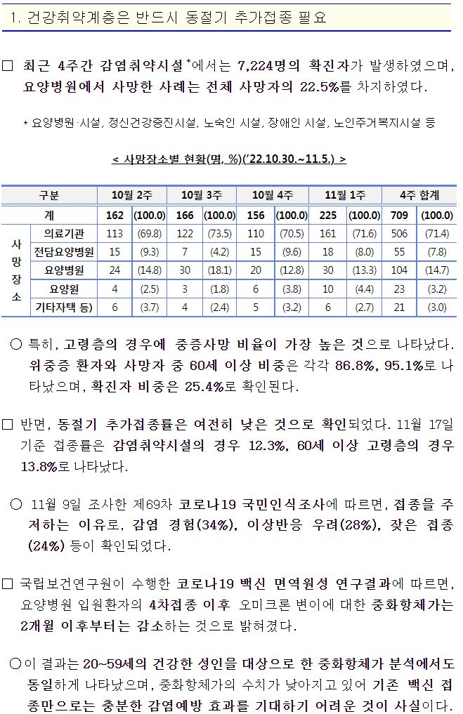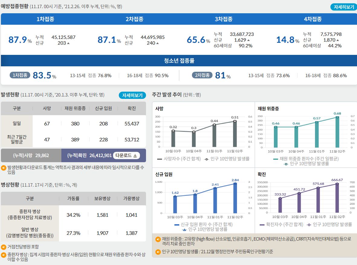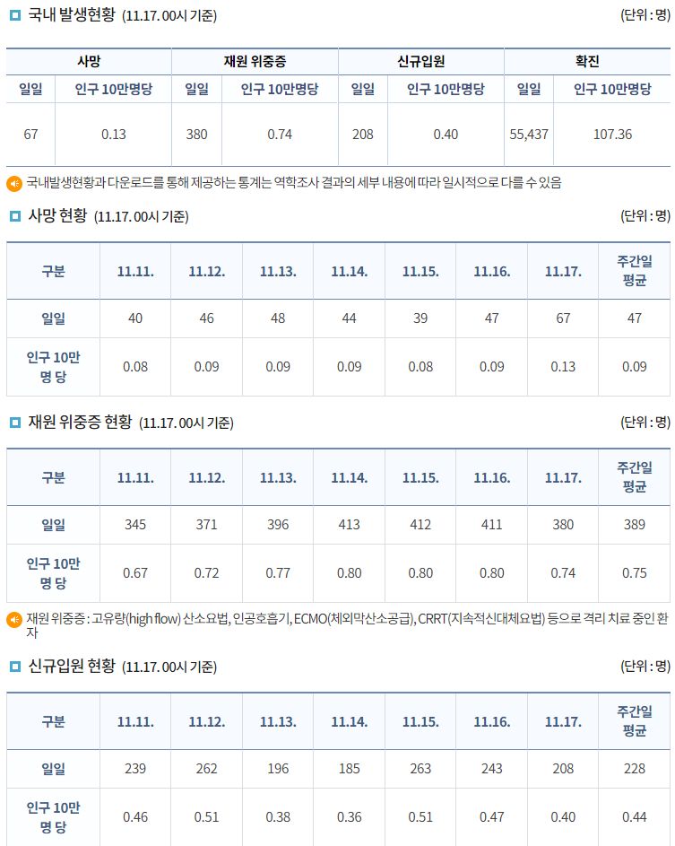 코로나19집계(2022.11.17. 0시기준) 확진 +5.5만, 사망 +67명, 중환자병상가동률 34%★/:/ 건강취약계층 동절기 추가접종 권고 본문