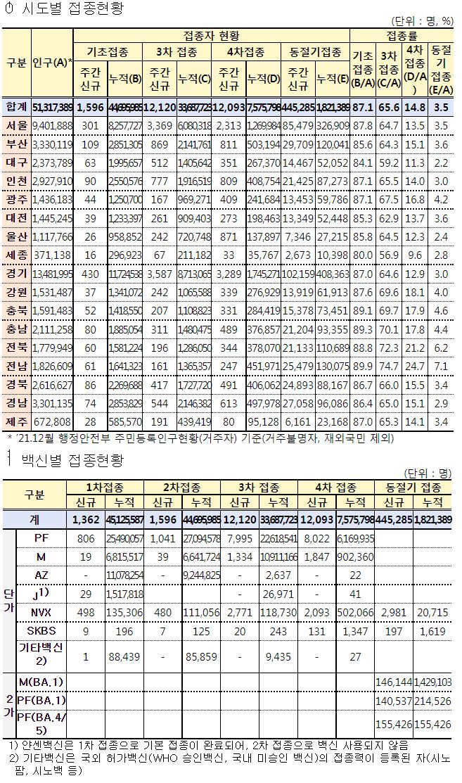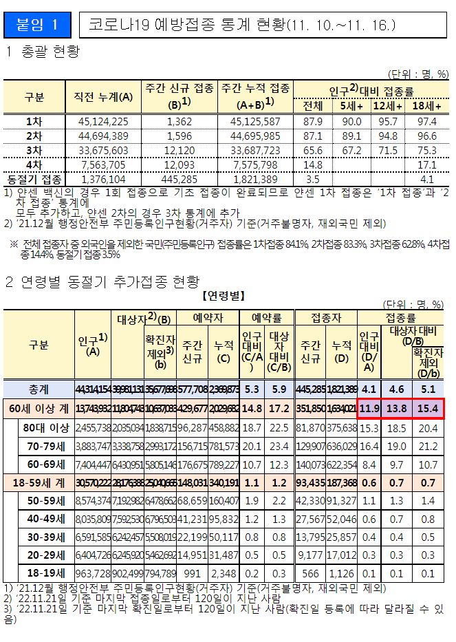 주간 코로나19 예방접종 통계 현황(11. 10.~11. 16.)