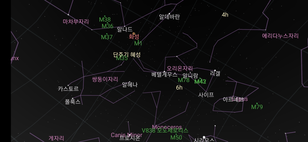 마차부자리(카펠라) ㅡ 화성 ㅡ 오리온자리(베텔규스, 삼태성, 리겔)
