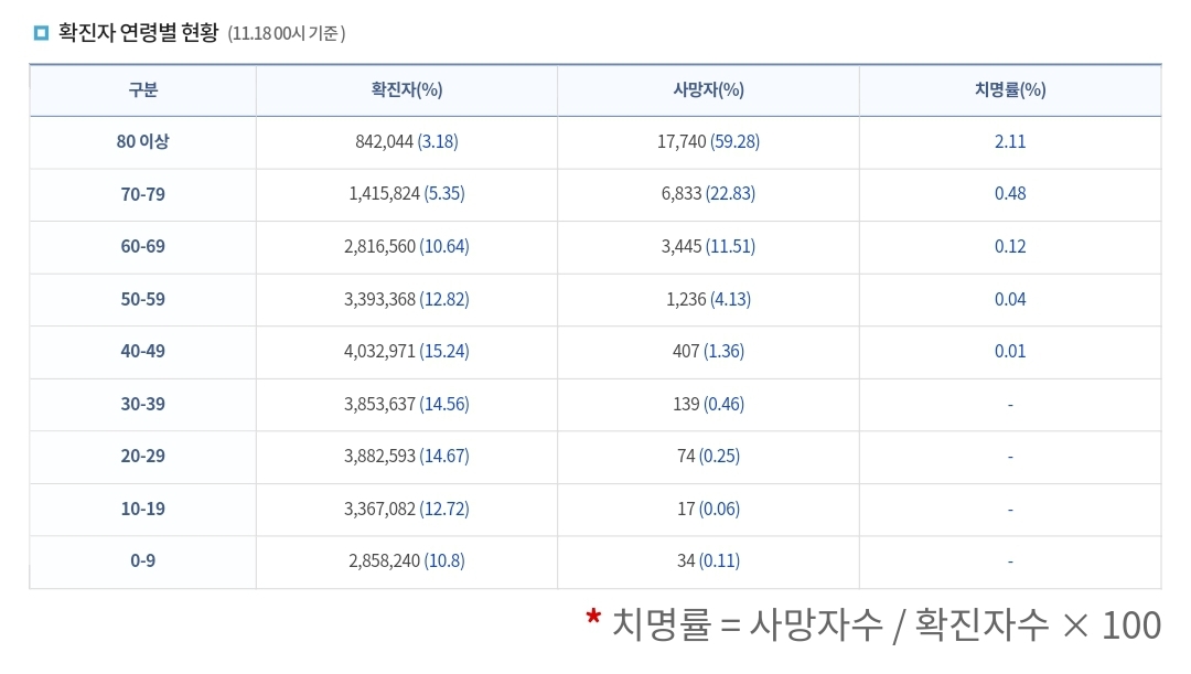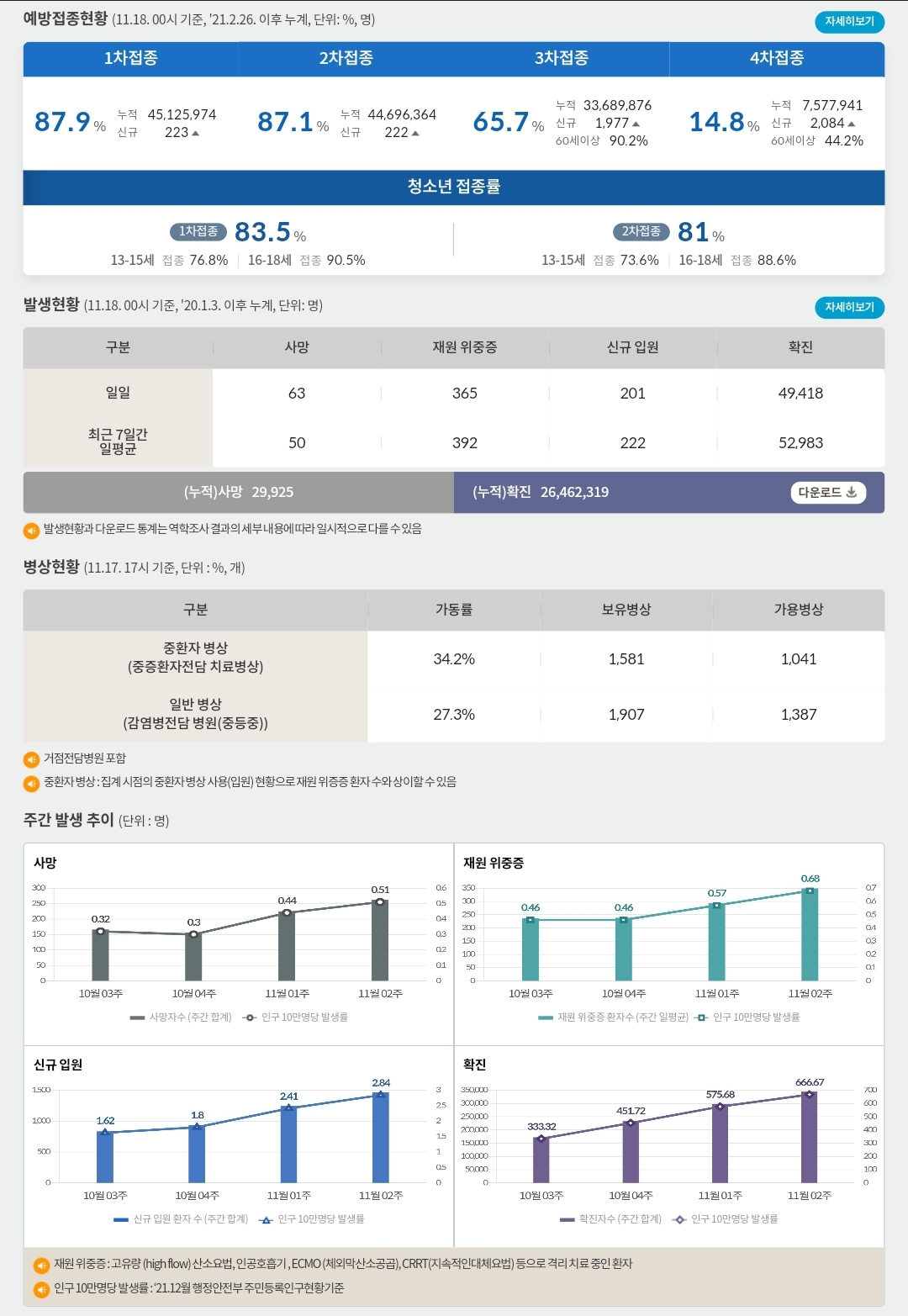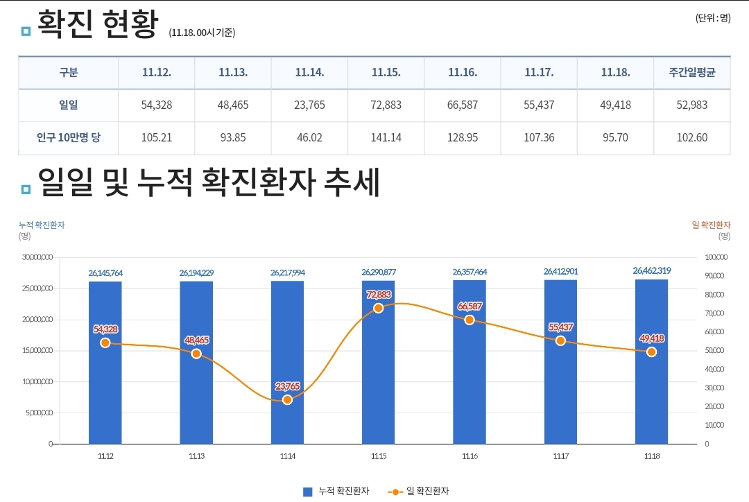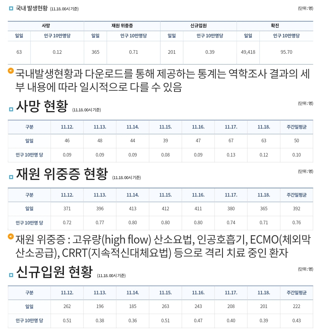 코로나19집계(2022.11.18. 0시기준) 확진 +4.9만, 사망 +63명, 중환자실가동률 34% 본문