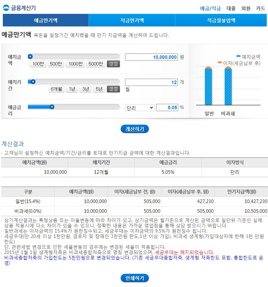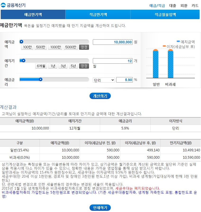 예금 금리 5.05%와 5.90%의 차이 계산(우리은행 금융계산기) 본문