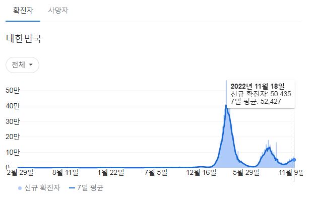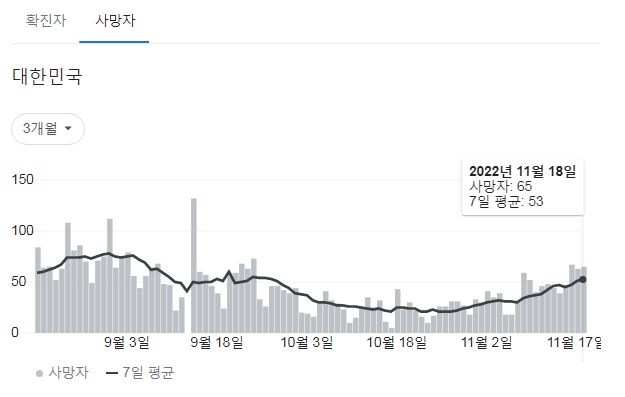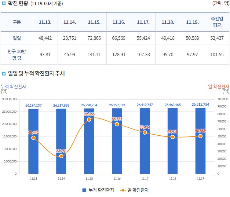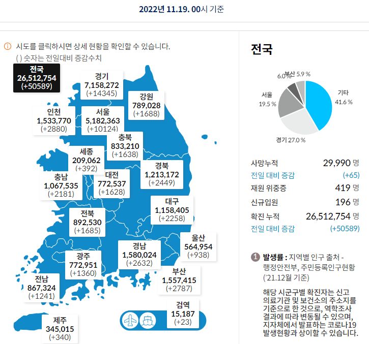 코로나19집계(2022.11.19. 0시기준) 확진 +5.1만, 사망 +65명, 중환자병상가동률 32% 본문