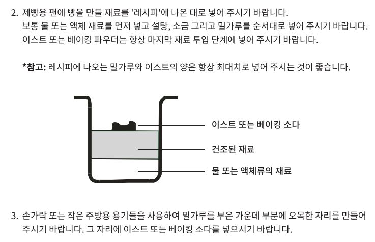 아래는 매직셰프 제빵기의 설명서에서 발췌. 다른 브랜드 제빵기(오성, 카이젤) 설명서도 비슷한데, 여기서는 물이나 우유 등 액체를 먼저 넣는 것은 같지만, 설탕과 소금을 그 다음에 넣고, 그 다음에 밀가루를 넣고, 그 다음에 마지막으로 이스트나 베이킹파우더를 넣으라고 적혀 있다. (가장 힘든 반죽과 발효를 제빵기가 해주는데 굳이 베이킹파우더를 넣을 이유가 없다. 당장 이스트를 사오자!)