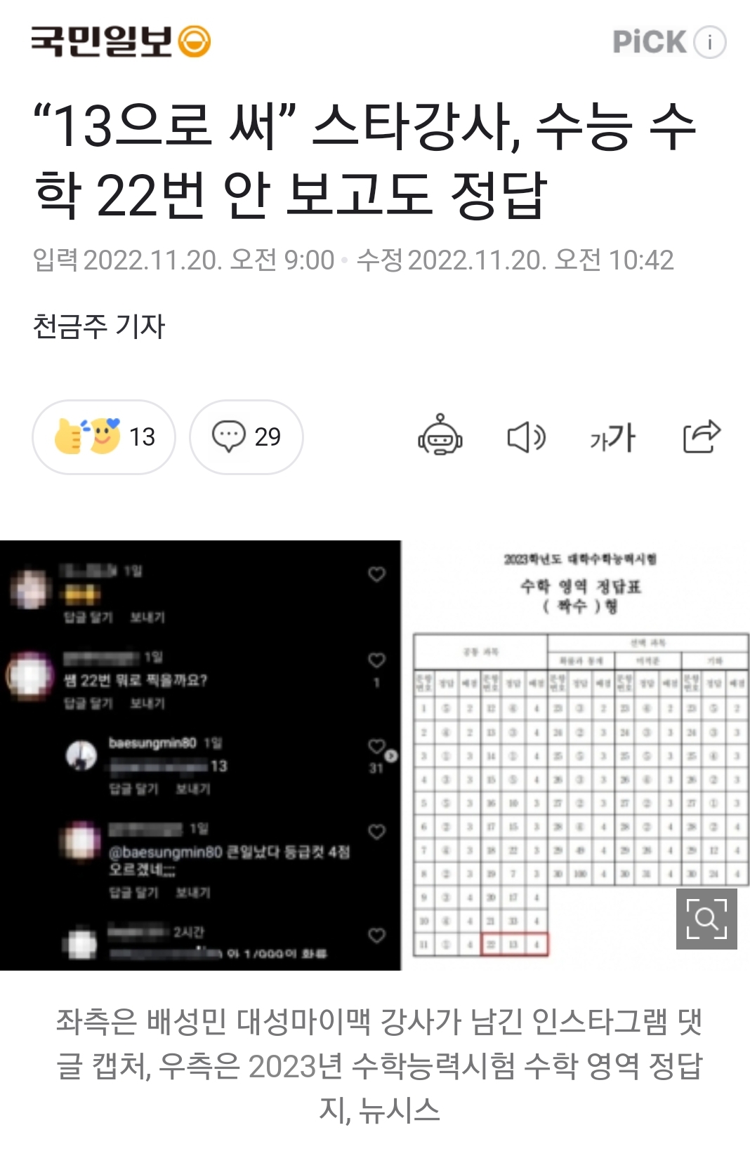 수학영역 스타강사가 2023학년도 대학수학능력시험(수능) 전날 제자에게 찍어준 정답이 실제 수능 정답이었던 것으로 확인돼 화제를 모으고 있다. 이를 본 많은 수험생은 “적중률 100%다” “덕