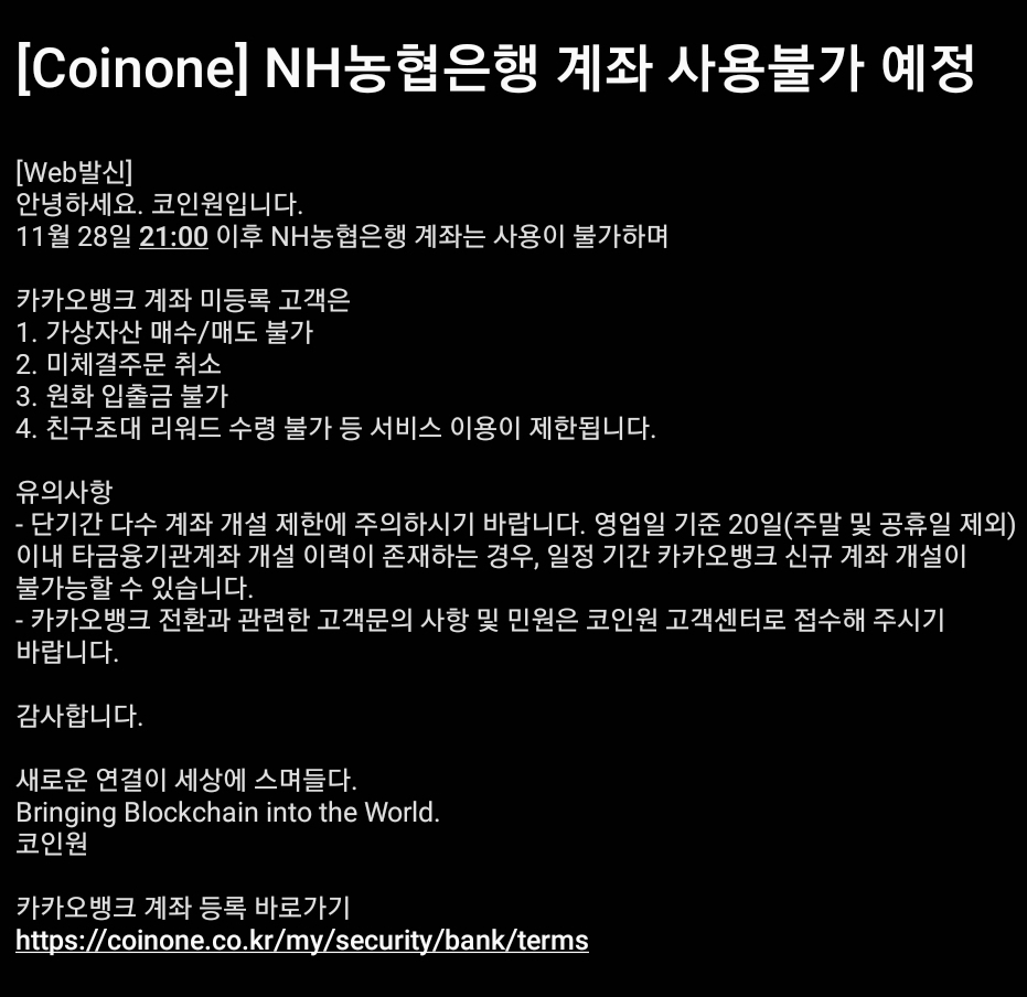 2022.11.28.이후 코인원(가상화폐거래소)에서 NH농협은행 계좌는 사용 불가 본문