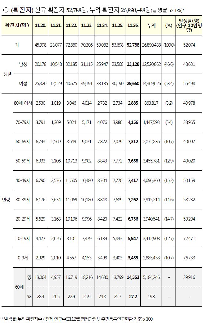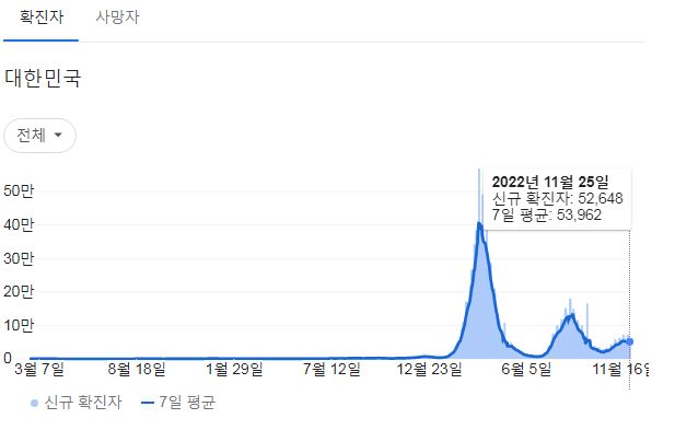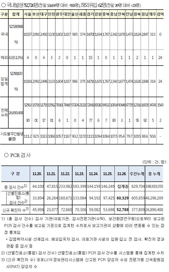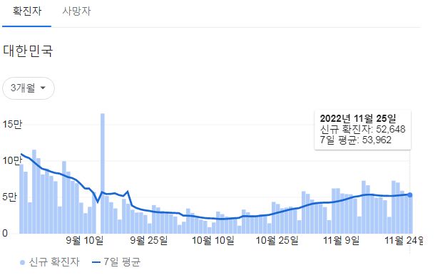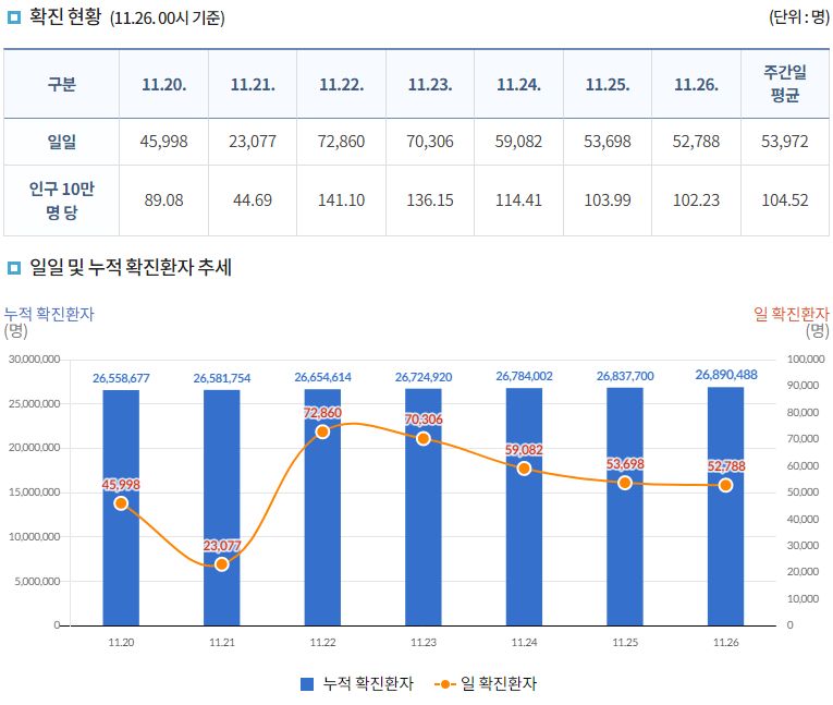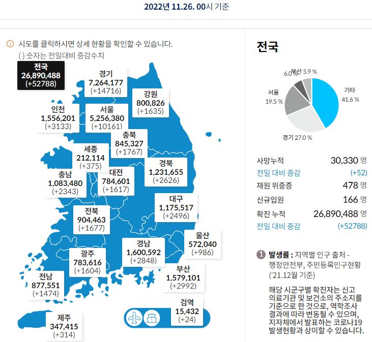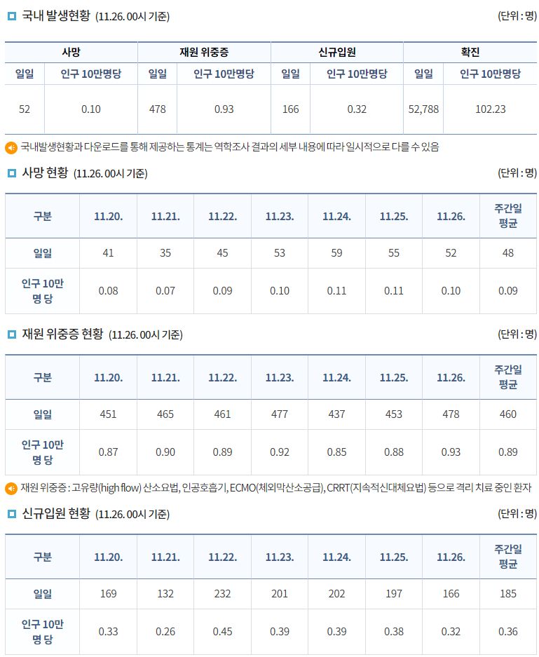 코로나19집계(2022.11.26. 0시기준): 확진 +5.3만, 사망 +52명, 중환자병상가동률 32% 본문