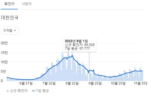 | 코로나19집계(2022.11.25. 0시기준): 확진 +5.4만, 사망 +55명, 중환자병상가동률 32% (0) | 2022.11.25 |