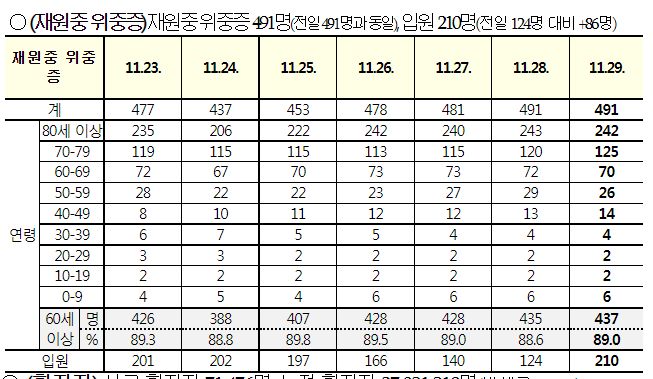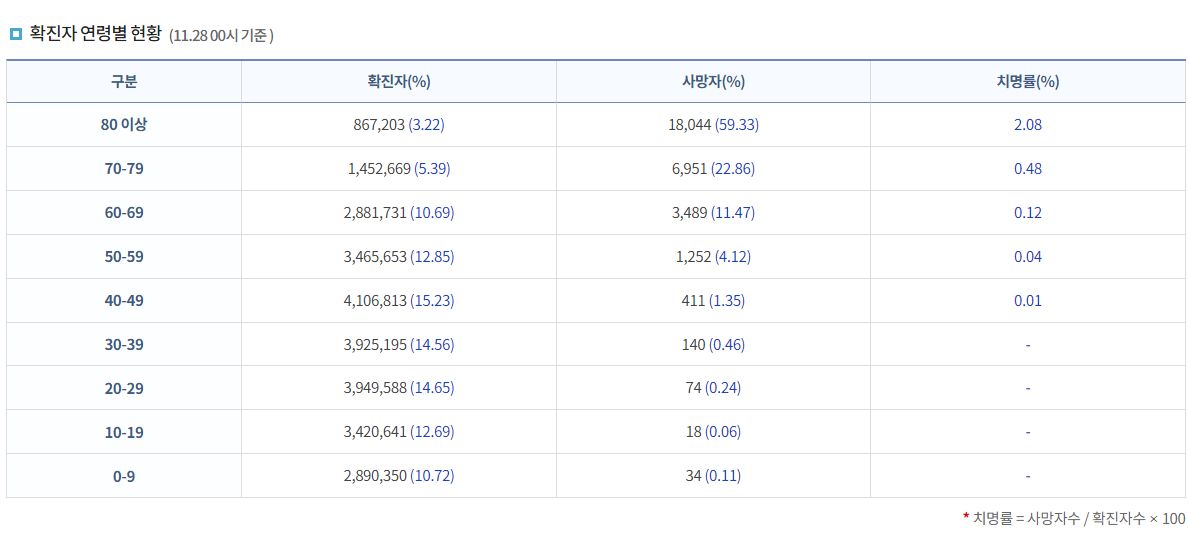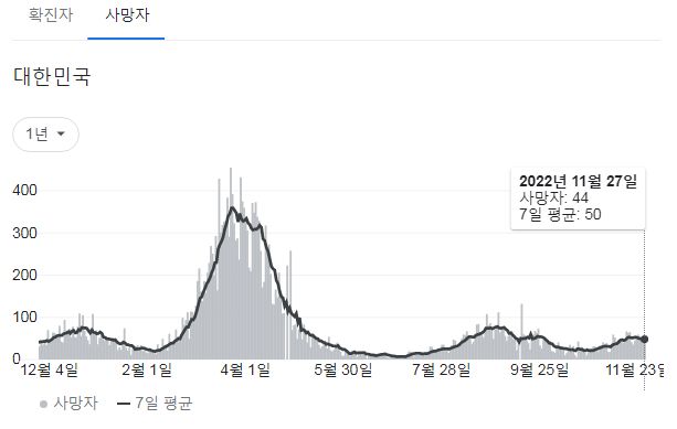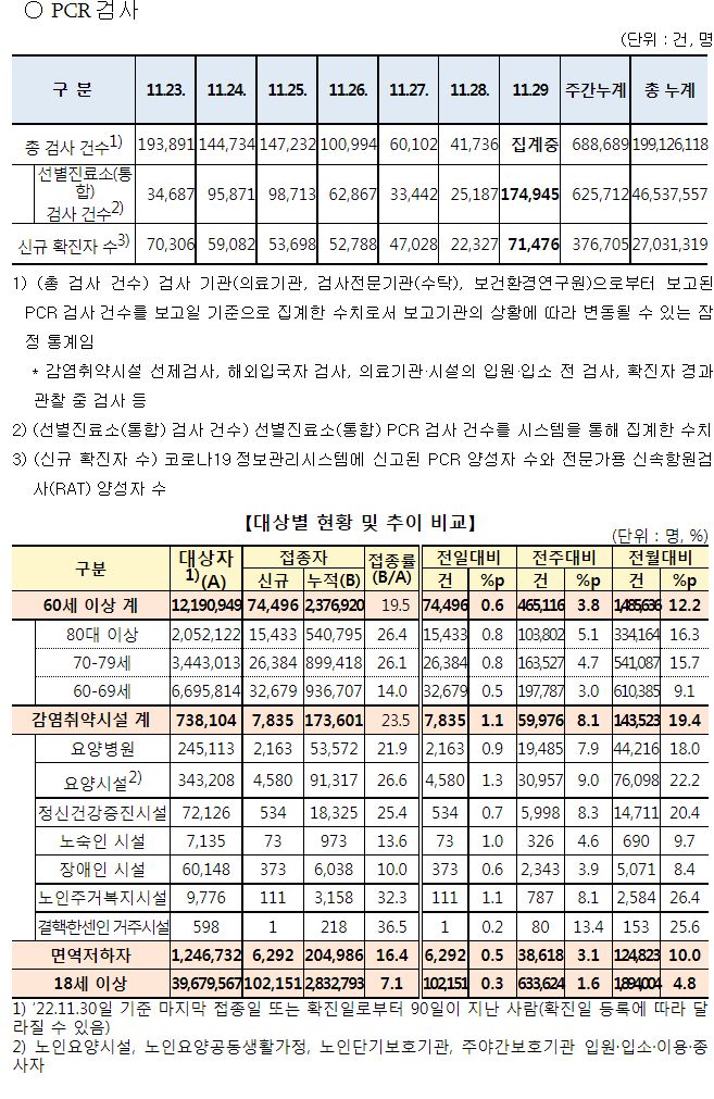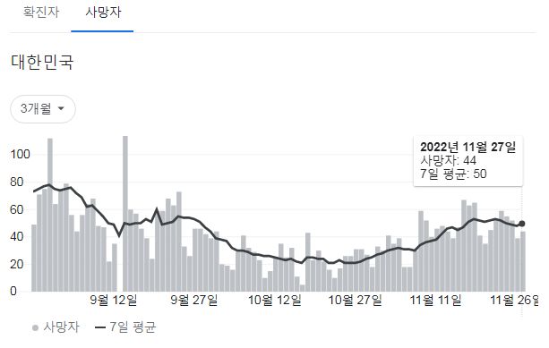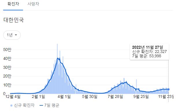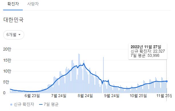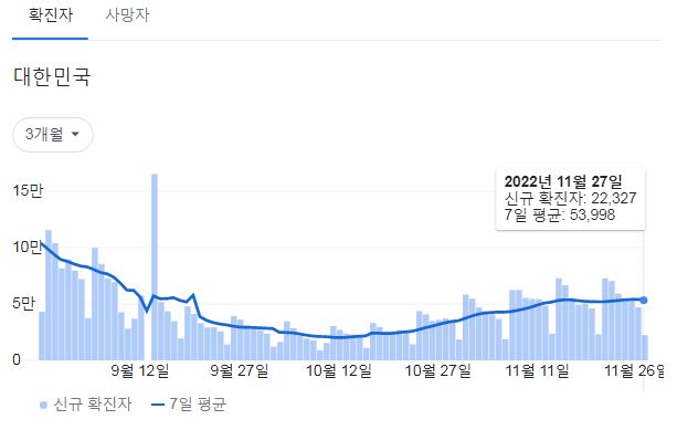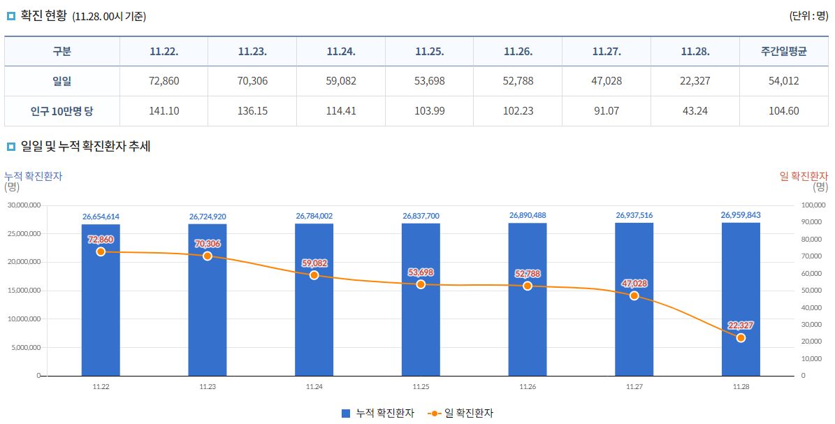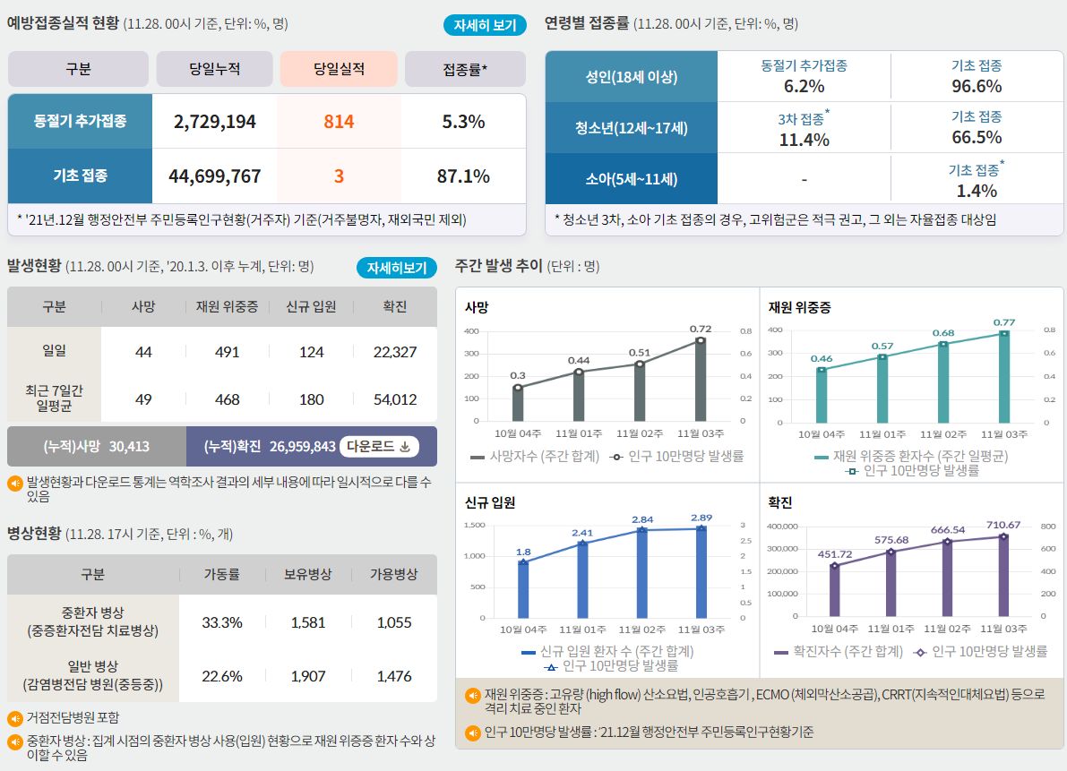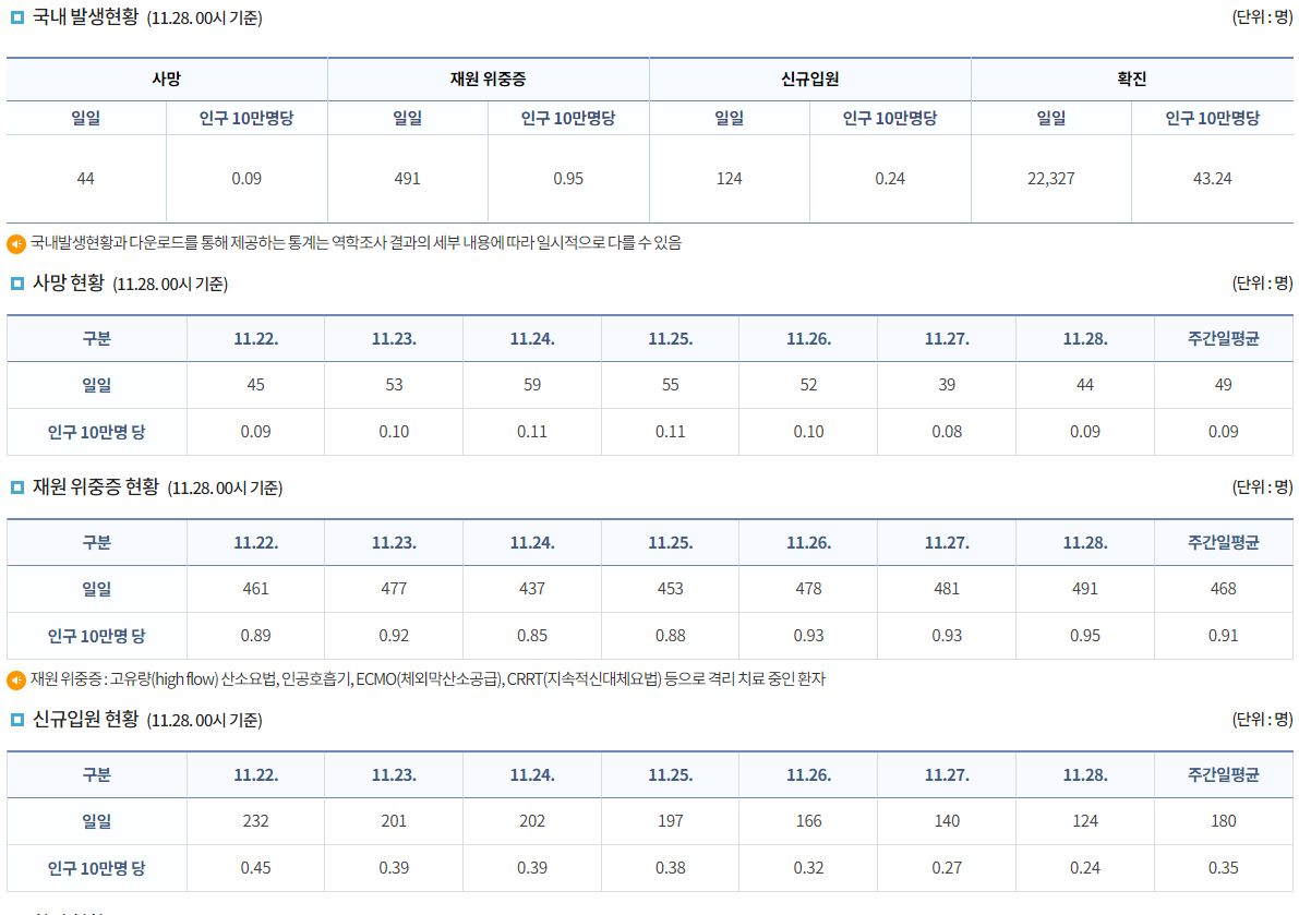 코로나19집계(2022.11.28. 0시기준): 확진 +2.3만, 사망 +44명, 중환자병상가동률 33% 본문