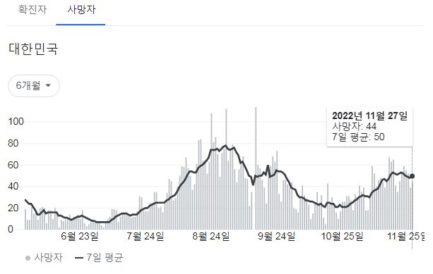 | 코로나19집계(2022.11.27. 0시기준): 확진 +4.7만, 사망 +39명, 중환자병상가동률 35% (0) | 2022.11.28 |