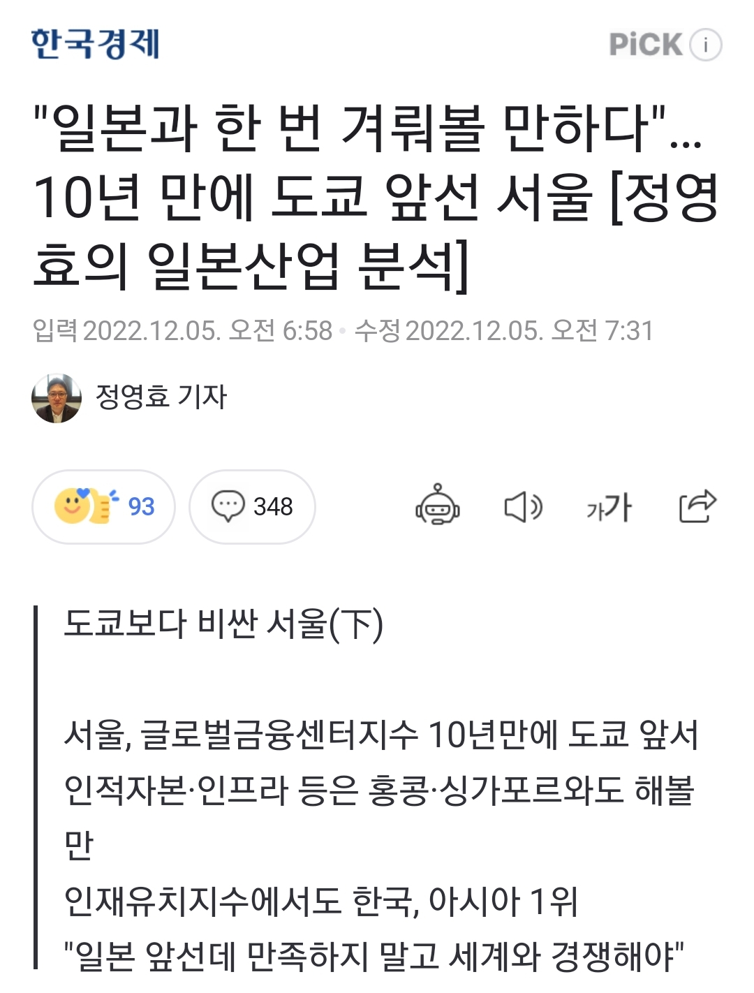 "일본과 한 번 겨뤄볼 만하다"…10년 만에 도쿄 앞선 서울 [정영효의 일본산업 분석]