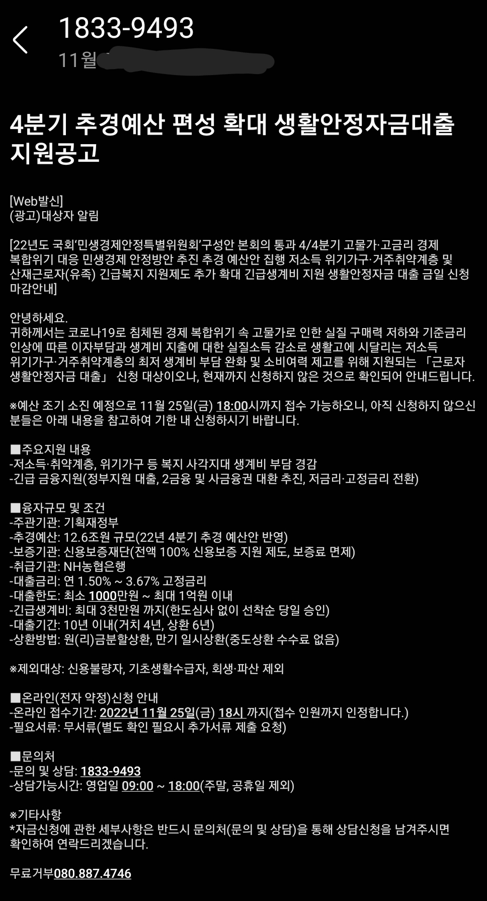 | 정부지원대출을 빙자한 금융사기문자 주의 (3) | 2022.11.06 |