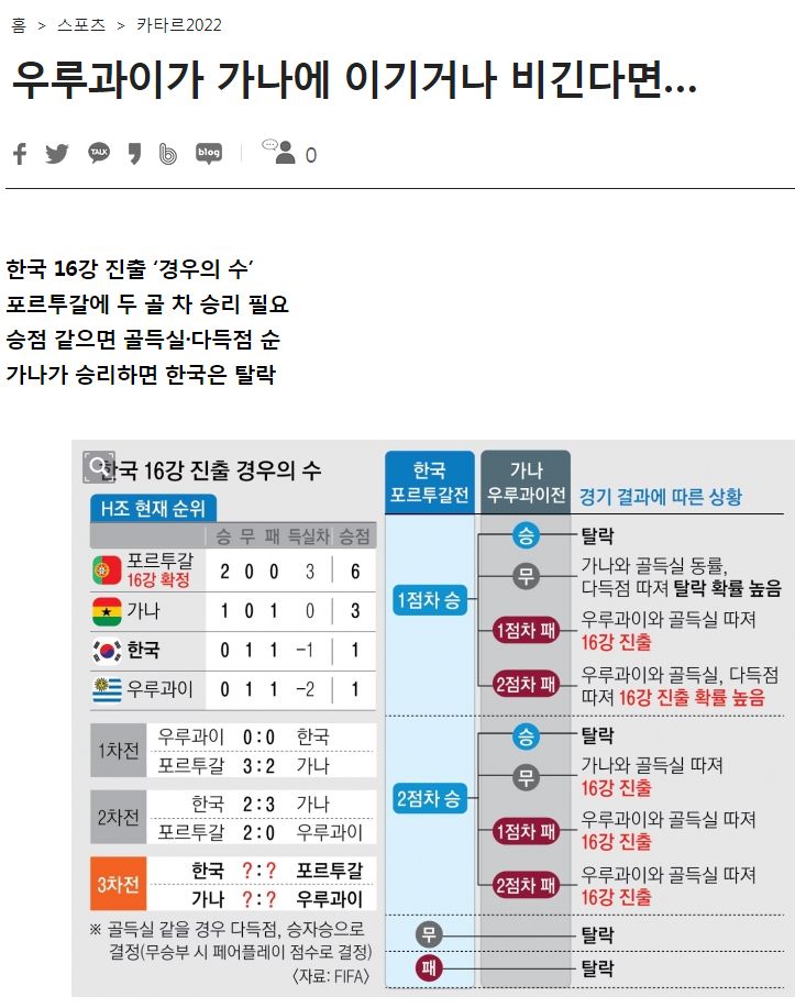 한국 16강 진출 ‘경우의 수’ 포르투갈에 두 골 차 승리 필요 승점 같으면 골득실·다득점 순 가나가 승리하면 한국은 탈락, 한국 축구가 2022 카타르월드컵 16강에 들려면 피할 수 없는 ‘경우의