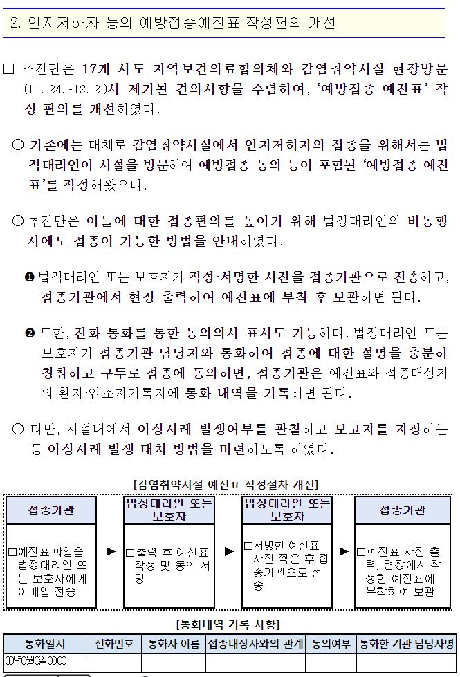 지금까지는 요양병원, 요양원 등 감염취약시설에 계신 어르신 중, 예방접종할 때 보호자가 필요한 인지저하자가 백신을 맞으려면 보호자가 그 어르신이 계시는 요양병원이나 요양원에 방문해 동의해야 하는 불편이 있었다고 한다. 이것을 접종기관과 전화통화해 구두로 동의해도 되고, 동의서를 팩스나 사진(MMS 문자를 말하는 듯)으로 접종기관에 전송해도 되도록 개선했다고. 이때 접종기관은 전송받은 사진이나 통화내역을 기록.