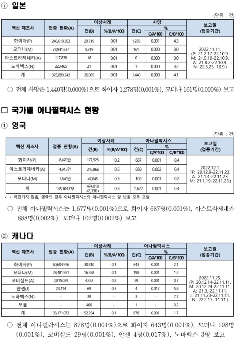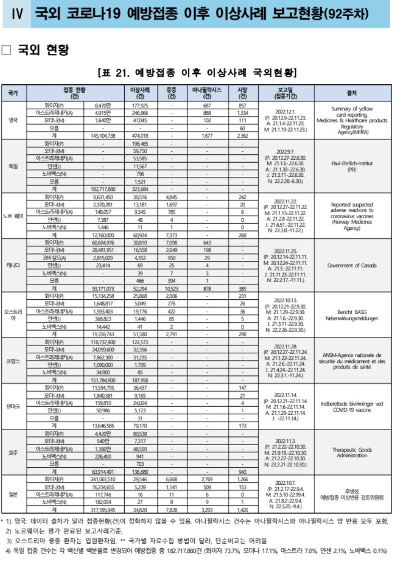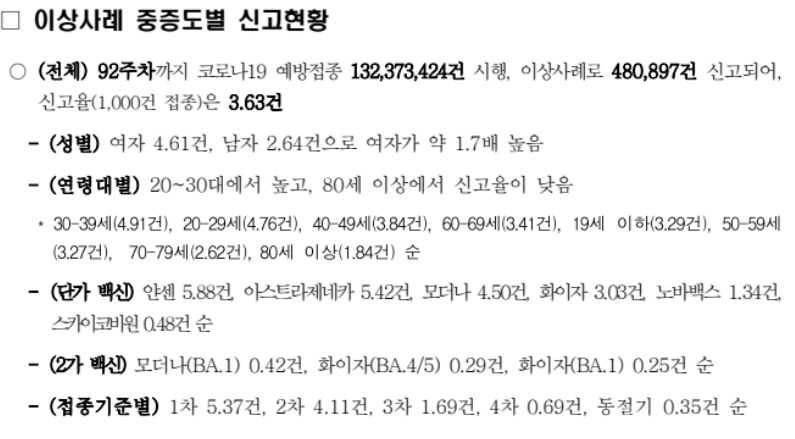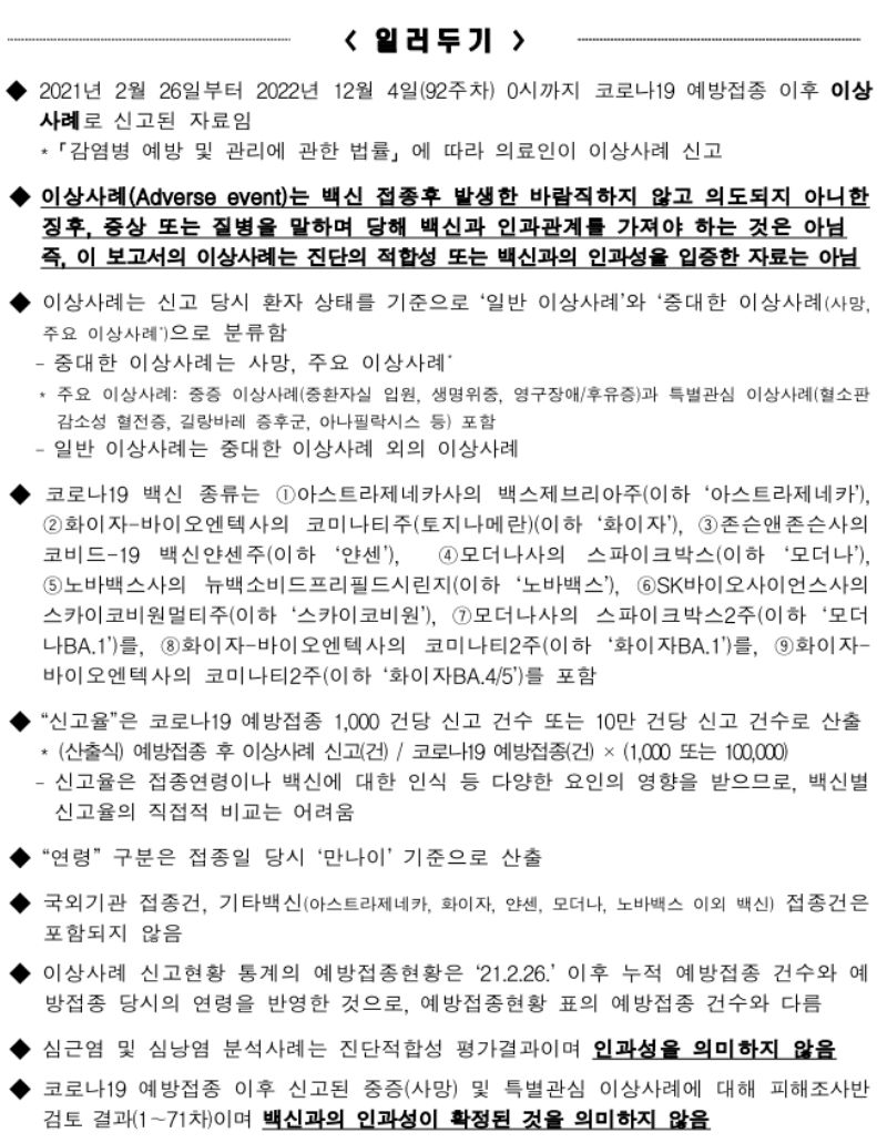 코로나19(2022.12.8) 예방접종 안전성 보고서(92차)/:/ 국내이상반응발생동향, 국외이상반응발생동향 본문