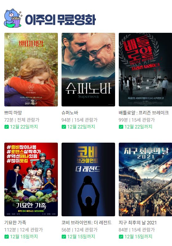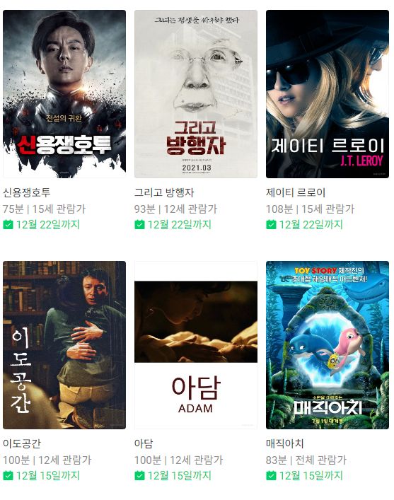 | (네이버시리즈온 무료영화) 팔백기마대, 글래디에이터:레전드 워리어, 비포 미드나잇, 가족의 색깔, 눈감은 여름 등 (0) | 2022.12.16 |