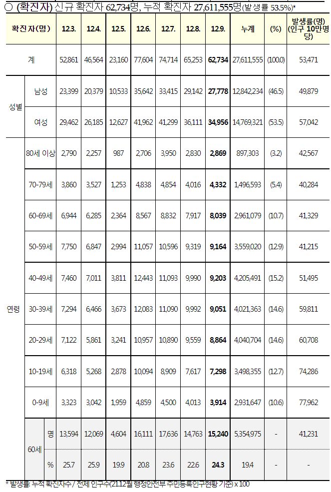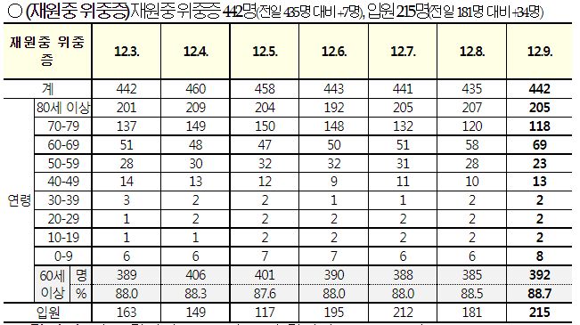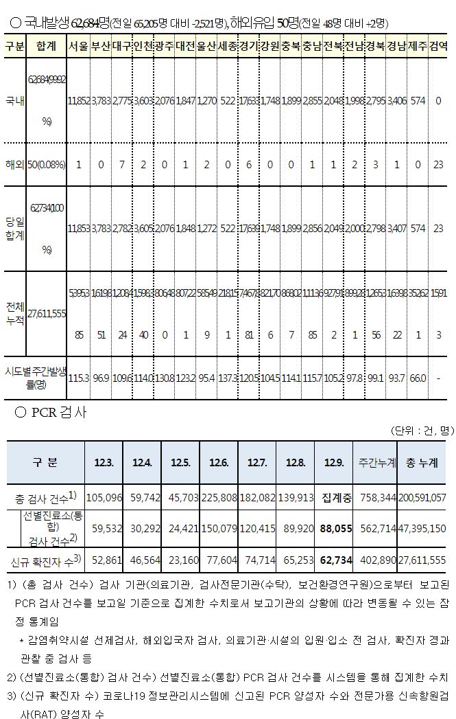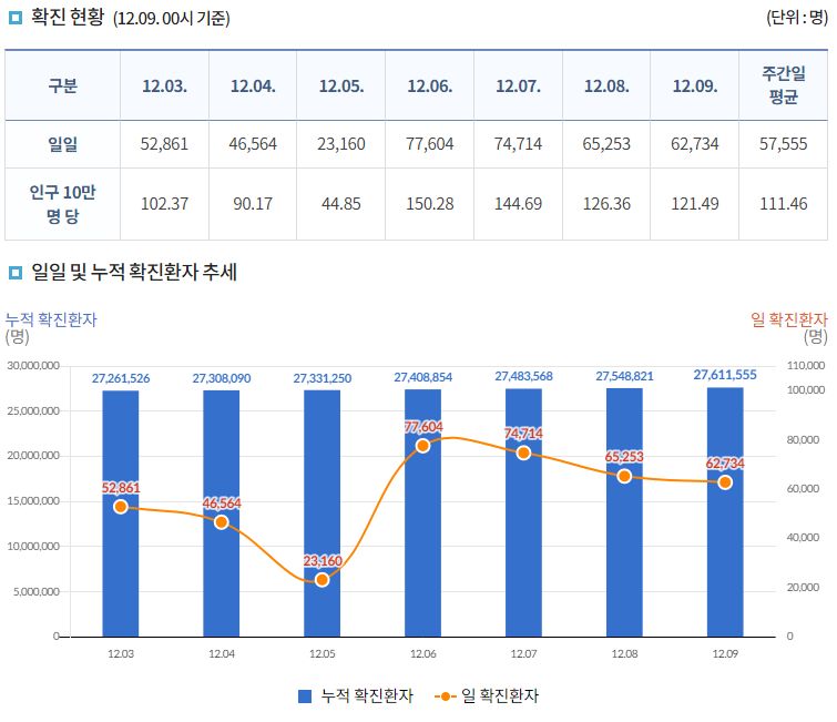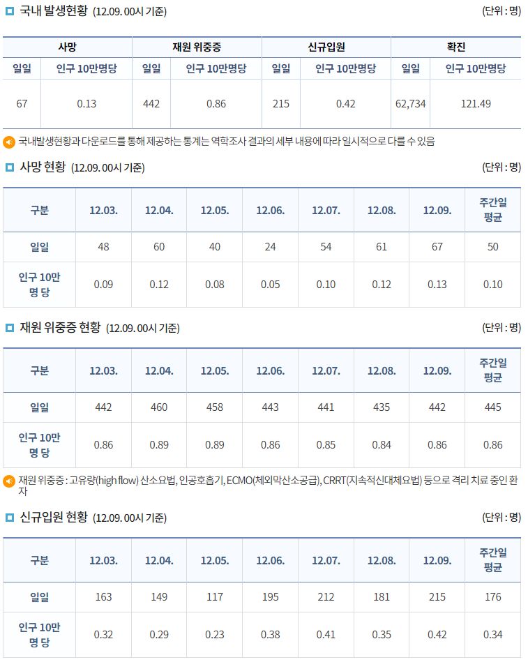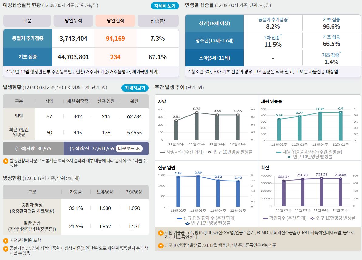 코로나19집계(2022.12.9. 0시기준): 확진 +6.3만, 사망 +67명, 중환자병상가동률 33% 본문