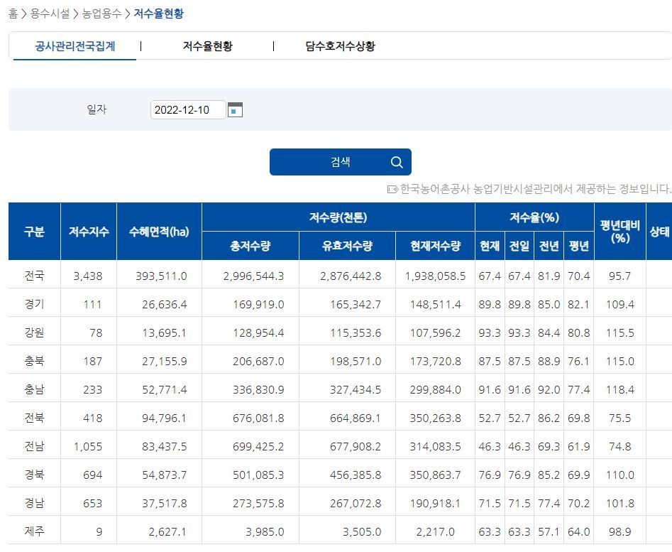 한국농어촌공사에서 운영하는 농어촌 정보 포털서비스로 저수지 저수율, 수질 등급, 안전진단, 농촌관광, 농촌주택표준설계도, 농지매물, 빈집매물 등의 정보를 제공합니다.