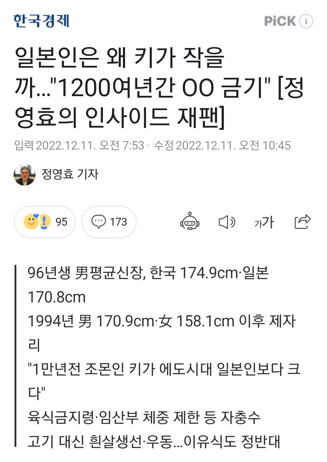 일본인의 평균신장추이에 관한 일본내 보도를 인용한 기사 본문