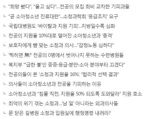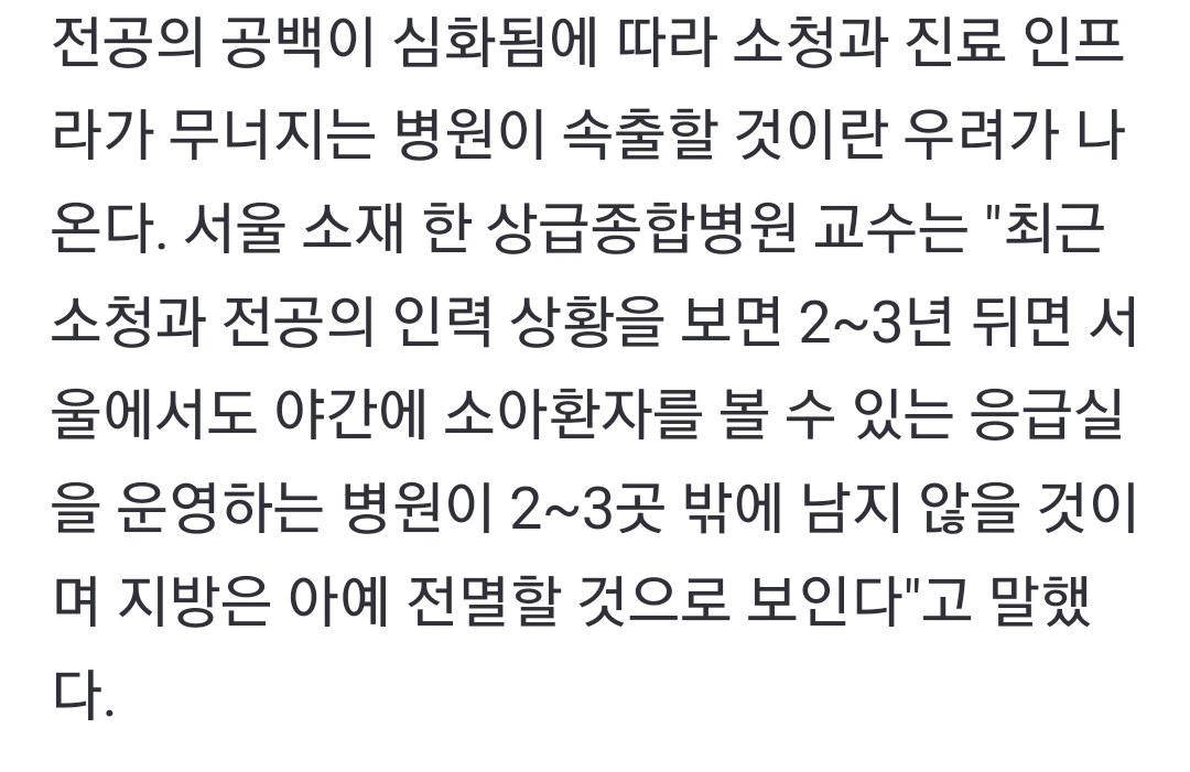 ㅡ 소아과 '도미노 붕괴' 시작 (......) 내년 소아청소년과 전공의 207명 필요한데 지원자 33명뿐(......) 국내 대학병원 상당수가 필요한 인력을 확보하지 못했다는 의미 (......) “전국 수련병원 중 교수가 당직을 서는 병원이 75%”(......) 소아청소년과 전공의 4년차는 170여 명으로 내년에 이들이 떠나면 대란이 일어날 것.
