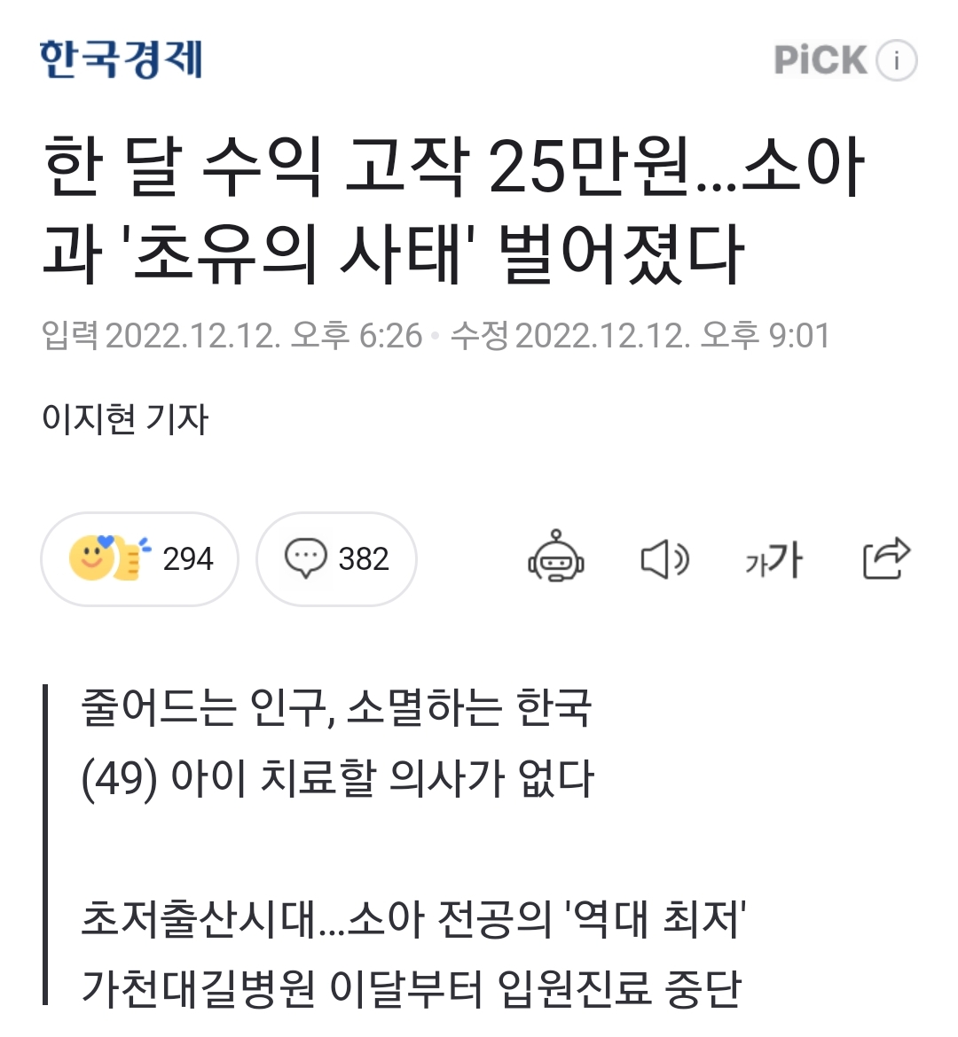ㅡ “최근 한 소아과 개원의가 ‘1년간 병원을 운영한 결과 한 달 수익이 25만원’이라고 토로했다”