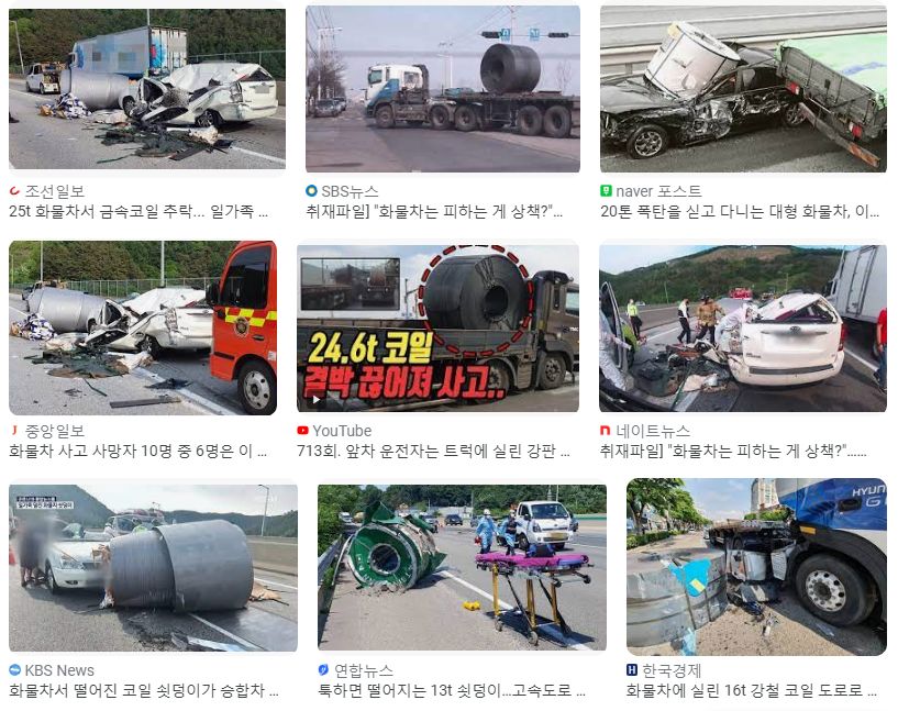 아래는 최근의 기사 하나. 블랙박스 제보인데, 화물차가 브레이크를 밟았는지 짐판 위에서 멈치없이 고박만 된 코일이 줄이 끊어지며 앞으로 굴러 트레일러 캡을 건드리고는 옆으로 떨어져 옆 차선을 주행하던 승용차 뒷부분을 차냈다. 다행이 도로가 막히지 않아 서행은 가능한 상황이어서, 떨어진 코일이 200미터 정도를 굴러갔지만 주변차량들이 사망자없이 피할 수 있었다고 한다.