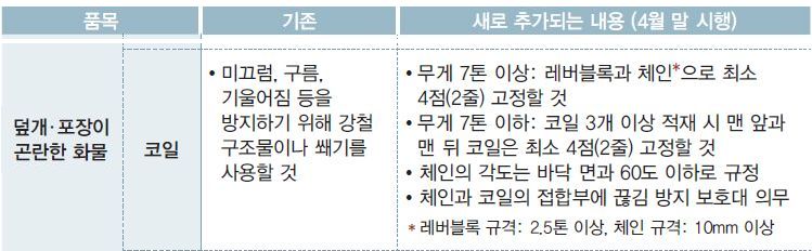 국토교통부가 오는 4월 말부터 화물의 적재 방법을 명시한 ‘적재화물 이탈방지 기준’을 대폭 강화한다. 화물 적재 방법을 보다 구체화해 적재물 낙하 사고를 근절하기 위함이다.적재화물 이