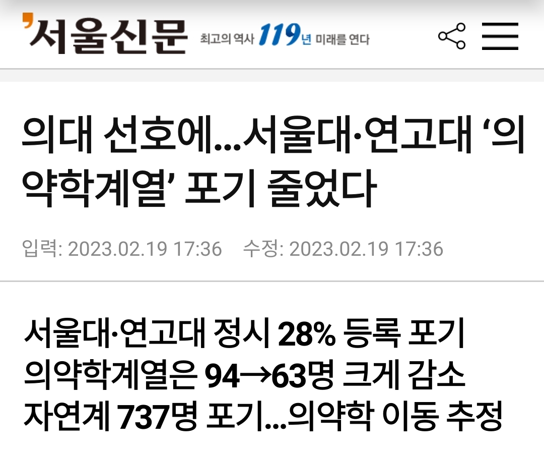 서울대·연고대 정시 28% 등록 포기 의약학계열은 94→63명 크게 감소 자연계 737명 포기…의약학 이동 추정 2023학년도 서울대, 고려대, 연세대의 정시모집 합격자 10명 중 3명이 등록을 포기한 것으